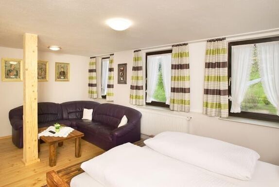 Panorama Suite 2 ohne Balkon Sehr geräumiges, helles Doppelzimmer mit großem Couchbereich, Sat-TV und separater Dusche mit WC. Schöner Ausblick auf die Vorderseite des Anwesens. Möglich ist Übernachtung mit Frühstück oder zusätzlich mit 3-Gänge-Menü zum Abendessen. Kinderermäßigung bis 14 Jahren Das Frühstück wird Ihnen an Ihrem reservierten Tisch Frühstück im gemütlichen Gastzimmer beim Eingangsbereich des Hauses vorbereitet. Zusätzlich können Sie Frühstücks-Spezialitäten a la Carte auswählen. Ausstattung der Panorama Suite: Doppelbett mit offenem Fußende, Hand- und Badetücher, Sat-TV, kostenloses WLAN, Föhn, Radio, großer Schrank, viel Platz für einen ruhigen und erholsamen Urlaub. Gerne können Sie auch die überdachte Hochterrasse auf der gleichen Etage als Raucherbereich nützen. Zusätzlich stehen Etagentoiletten zur Verfügung. Mindestaufenthalt für diesen Preis: 3 Nächte Belegung: 2 Person