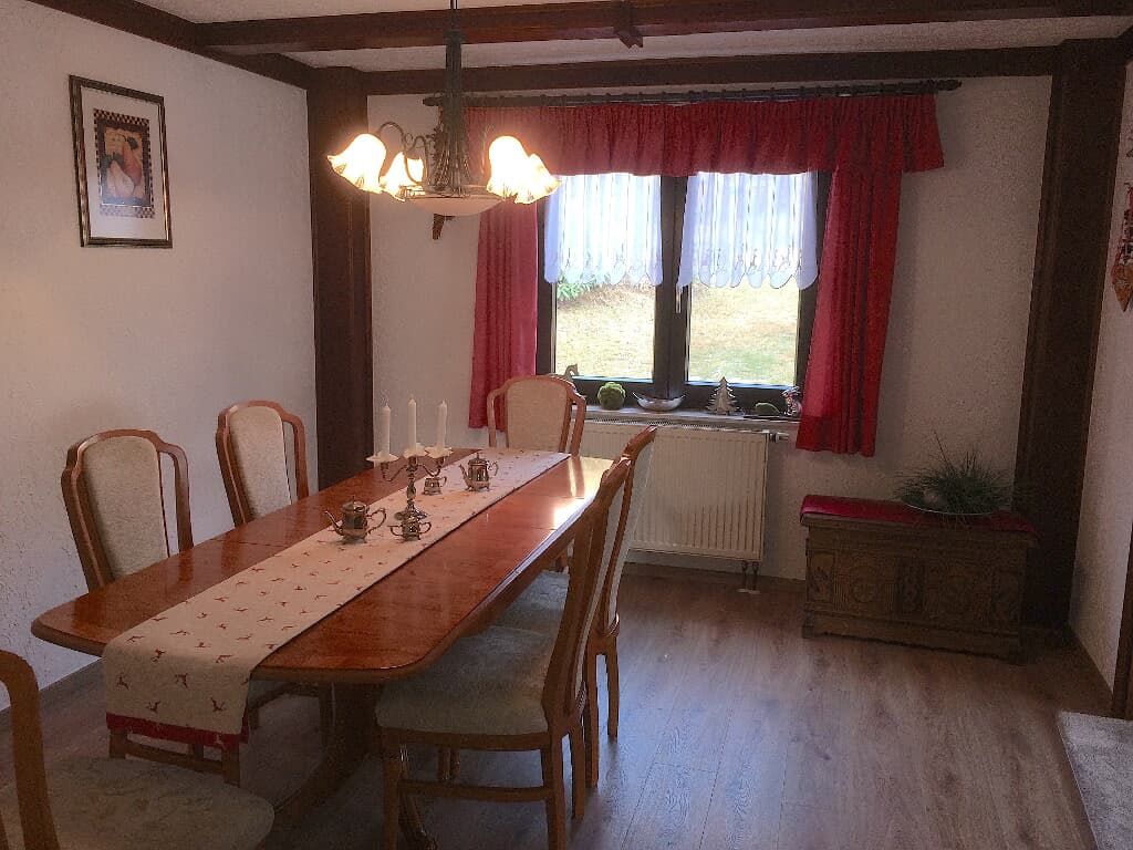 Herzlich willkommen im Ferienhaus Baumann! Unser bayerisch-stylisch eingerichtetes Haus verfügt über ein Doppelzimmer und ein Doppelzimmer mit Zusatzliege, WC, im Obergeschoss. Im Spielzimmer befindet sich ein Himmelbett .Das Badezimmer im Erdgeschoss bietet Badewanne, Dusche und Fön.Daneben WC.Im gemütlichen Wohnzimmer mit zwei großen Sofas und SAT-TV ist Entspannen garantiert. Es schließt an das Esszimmer mit Ausziehtisch an. Die moderne Küche ist vollausgestattet mit Herd, Backofen, Mikrowelle, Geschirrspüler, Kühlschrank, Gefrierfach, Toaster, Eierkocher, Kaffeemaschine, Wasserkocher, Geschirr, Besteck und vielen weiteren Utensilien. Waschmaschine und Trockner im Untergeschoss. Highlight vom Ferienhaus ist die Terrasse mit Grill und überdachten Sitzplatz. Der Wohlfühl- garten mit Liegestühlen und Spielplatz punktet. Parkplatz, Garage nach Verfügbarkeit und WLAN kostenfrei. Wir freuen uns schon auf Ihren Besuch.