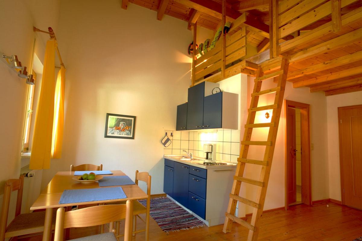 Im Apartment 6 liegen Wohn- und Schlafbereich auf einer Ebene. Zusätzlich verfügt Apartment 6 über eine Galerie mit 2 Schlafplätzen. Das Apartment liegt nach Osten und hat einen Balkon