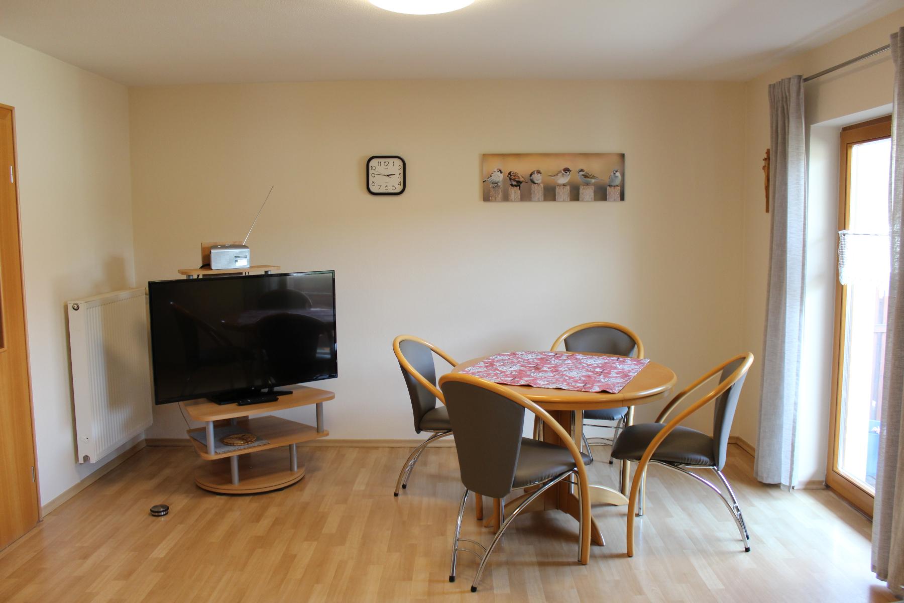 Die Ferienwohnung (60 qm) mit Balkon befindet sich im ersten Stock und hat einen separaten Eingang. Sie besteht aus einer Wohnküche, zwei Schlafräumen und einem Bad mit DU/WC.