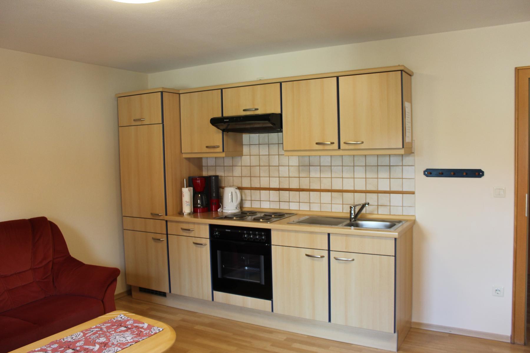 In der Wohnküche erwartet Sie eine voll ausgestattete Küche (Kühlschrank, Kaffeemaschine, Wasserkocher, Toaster, Backofen und E-Herd mit vier Herdplatten). Außerdem liegen Geschirrtücher, Reinigungsmittel und Kaffee- und Teezubehör für Sie bereit. Des Weiteren ist der Raum mit einer Sitzgruppe, Coach, Sessel und Fernseher ausgestattet.