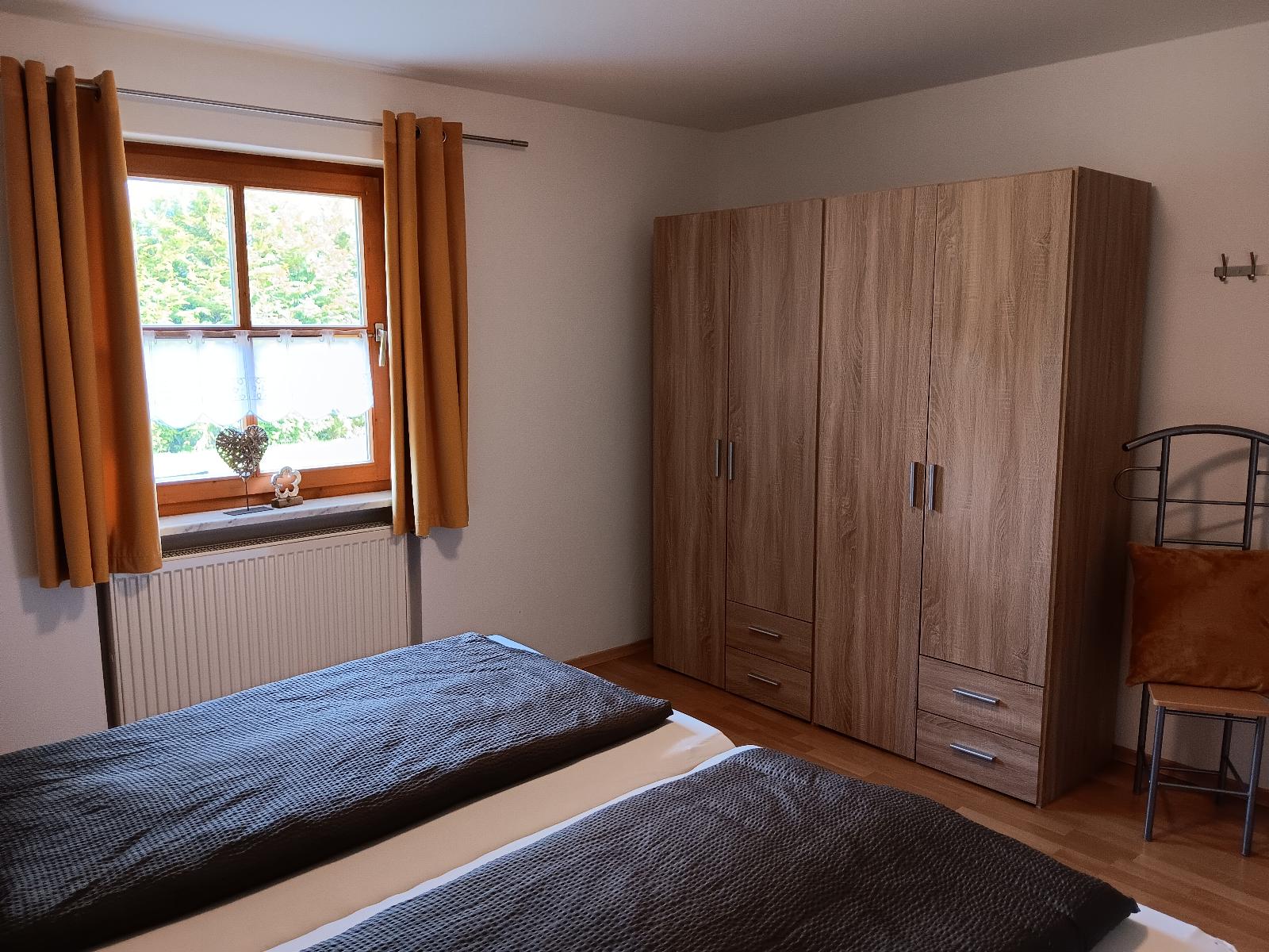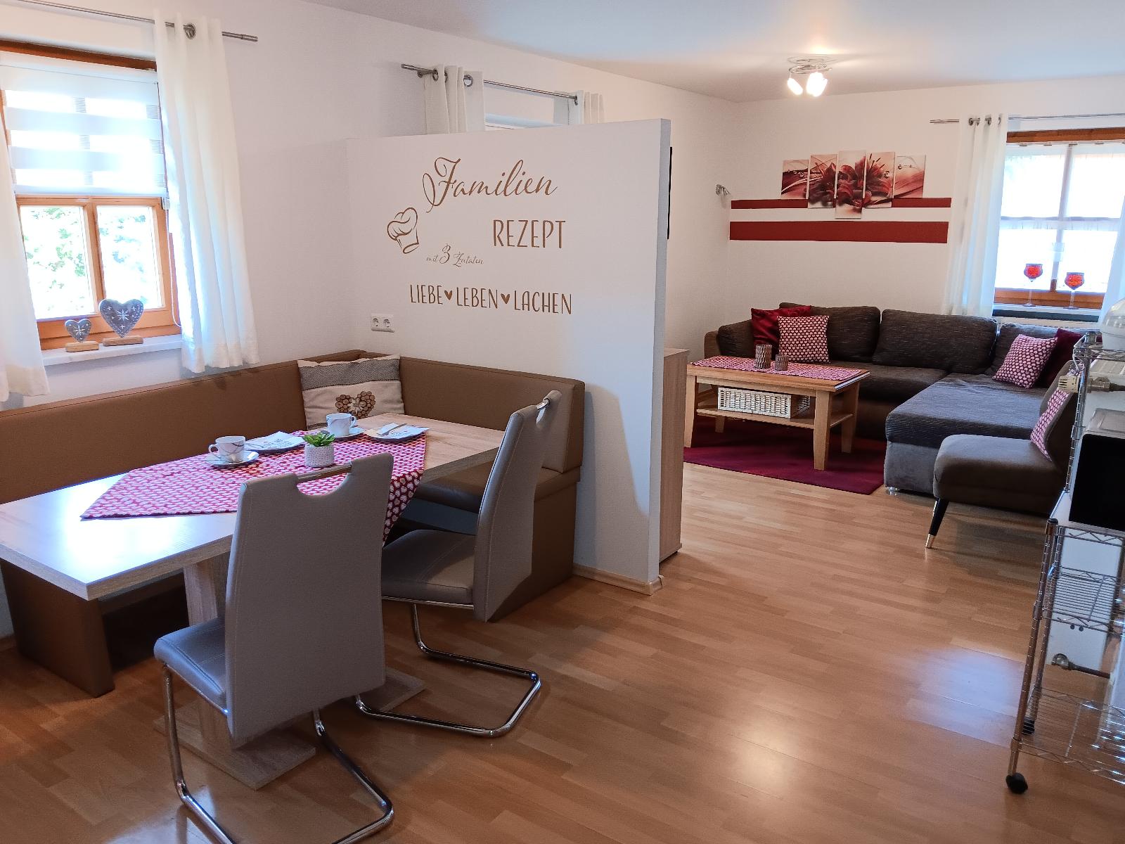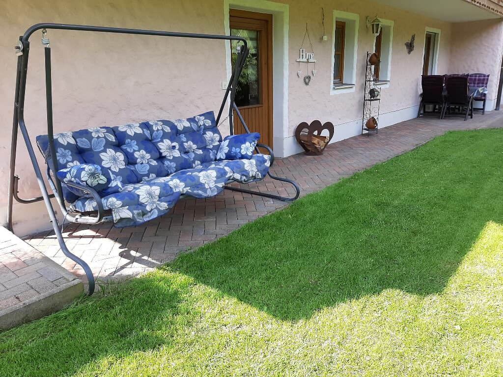 Küche mit Spülmaschine und vieles mehr. Mit Balkonterrasse, Wohnzimmer mit kleinen Balkon und mit Sat-TV -Radio, DVD Spieler , drei Schlafzimmer ( ein Schlafzimmer davon mit extra abgetrennten Raum mit Dusche -Toilette und Waschbecken und extra TV-Sat )belegbar bis 7 Personen siebte Person Zustellbett) Garten mit Spiel- und Liegewiese , Schaukel , Kinderrutsche, großes Trampolin und Gartenmöbel. Unsere Ferienwohnungen liegen in Waldnähe . Der Rad- und Wanderweg sowie das Osserbad sind in unmittelbarer Nähe.