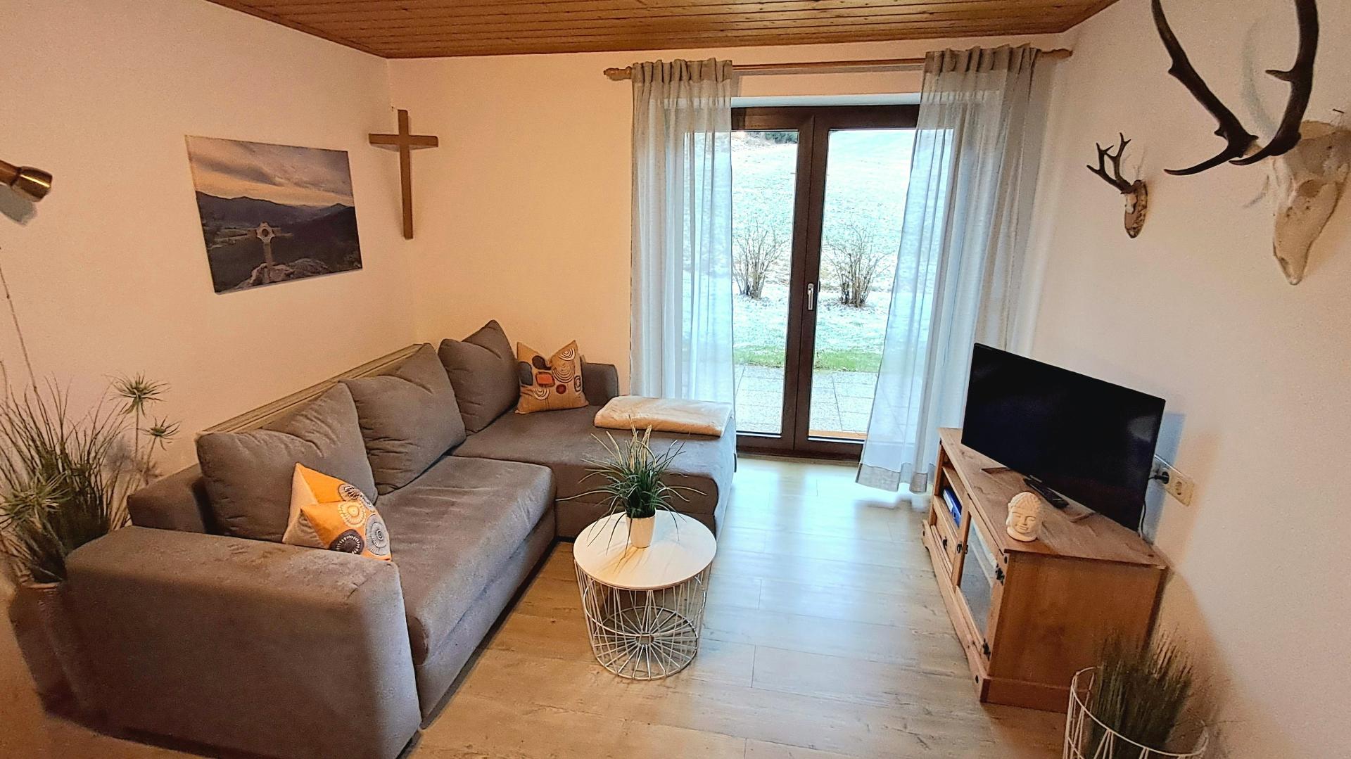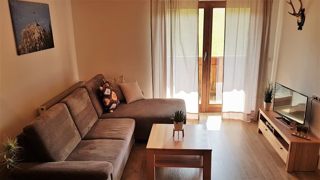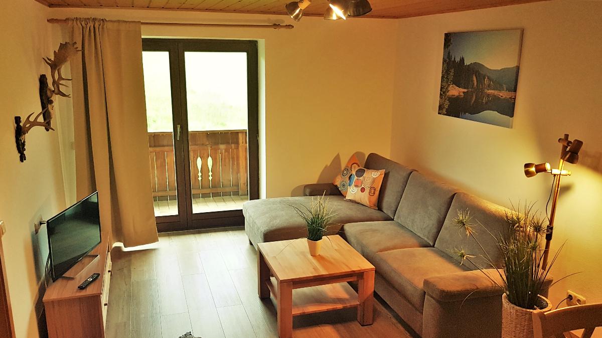 Das helle Wohnzimmer mit großem gemütlichen Sofa, Flachbild-TV und Zugang zum Südbalkon lädt zum Verweilen ein.