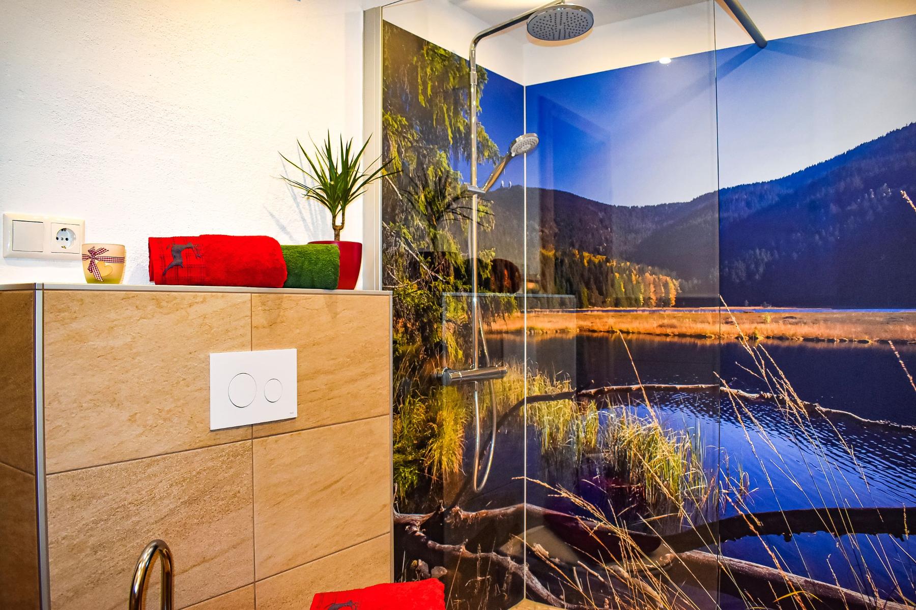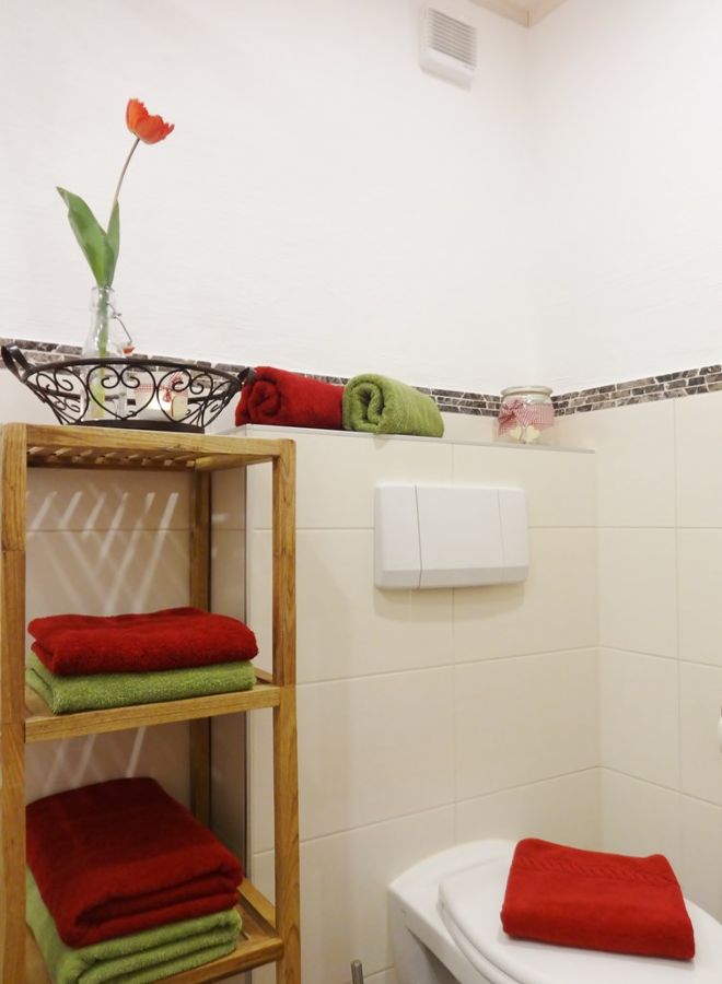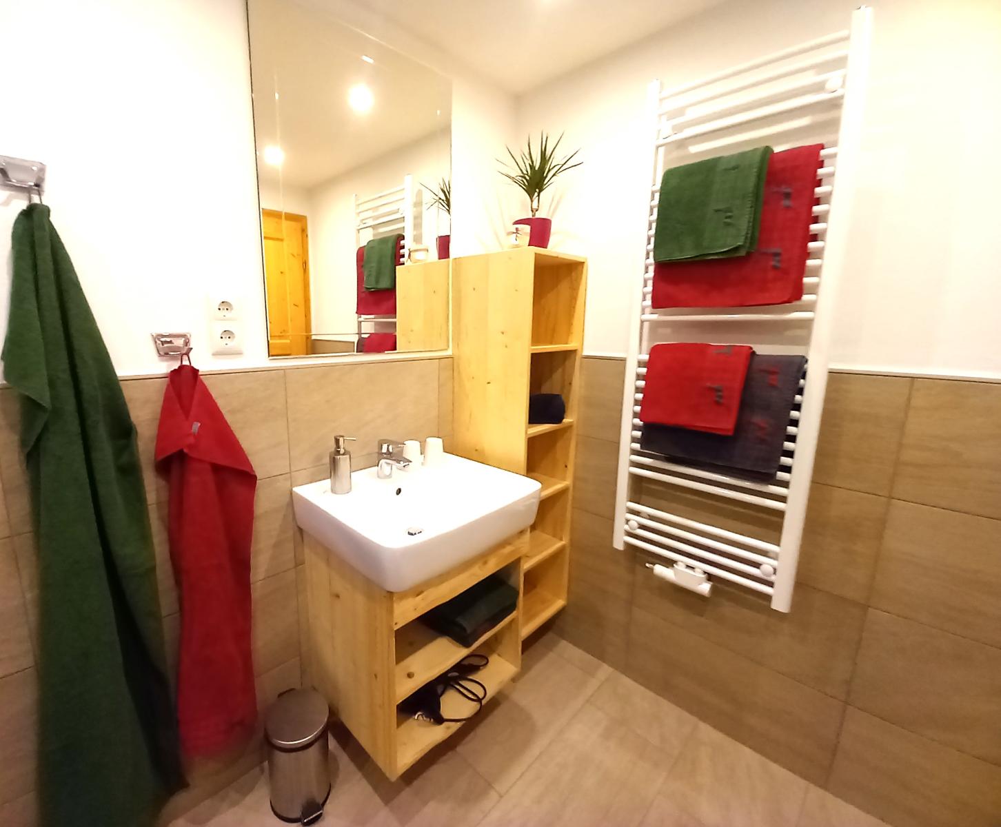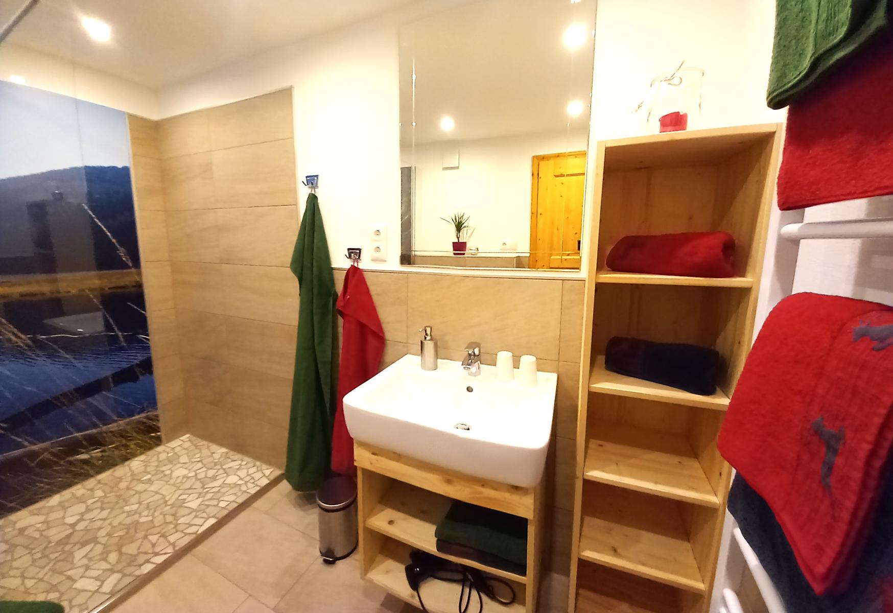 Badezimmer mit Dusche, WC, Handtuchtrockner und Fön, Dusch- und Handtücher