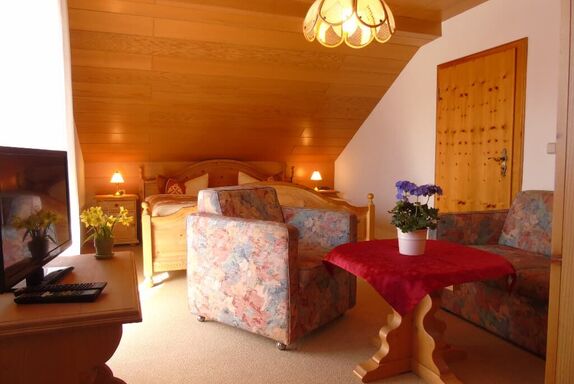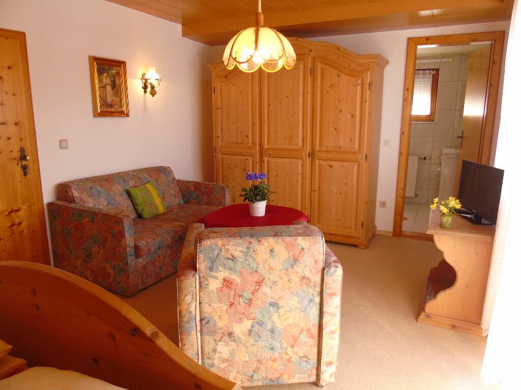 DZ mit DU/WC, Fön, Sat-TV, W-LAN, Radiowecker, Kühlschrank, Fön, Balkon, Südwestlage mit Fernblick, reichhaltigem Frühstück, Parkplatz, Liegewiese mit Kneipbrunnen sowie Rodelmöglichkeit im Winter am Haus