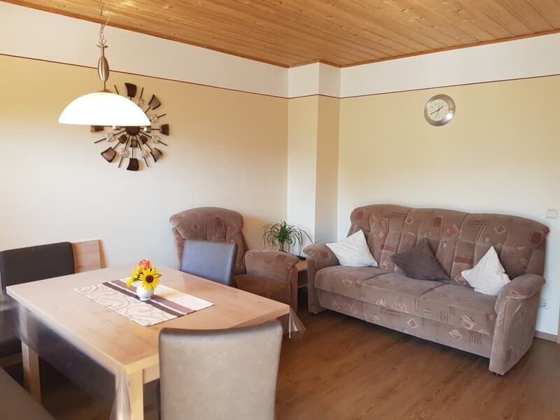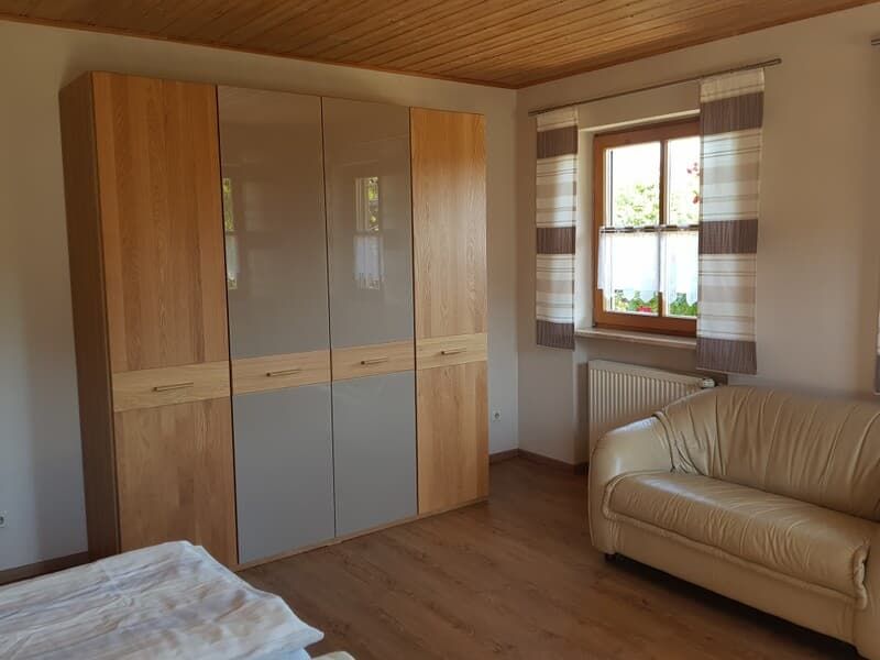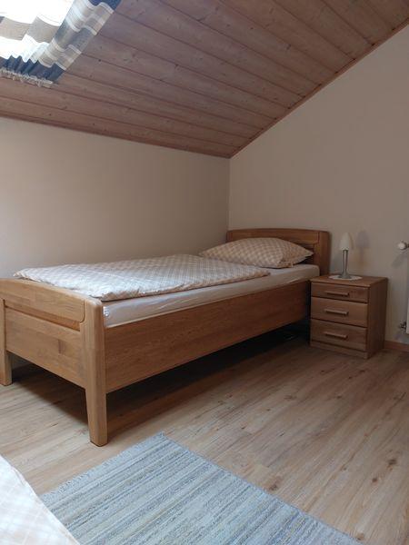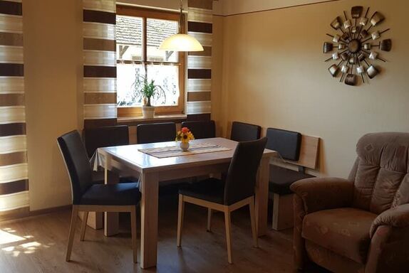 Die Ferienwohnung mit separatem Eingang befindet sich im Erdgeschoss, ist ca. 80 m² groß und geeignet für 2 - 5 Personen. Sie hat 2 Schlafzimmer mit je einem Doppelbett, eine Wohn- und Essecke mit TV, eine vollausgestattete Küche mit Kühlschrank, E-Herd mit Backofen, Kaffeemaschine, Spülmaschine, Wasserkocher und Toaster und ein Badezimmer mit Dusche, Badewanne und WC. Außerdem finden Sie auf der Terrasse mit Blick auf den Hof Gartenmöbel und Liegestühle. Kinderbett und Hochstuhl sind vorhanden.