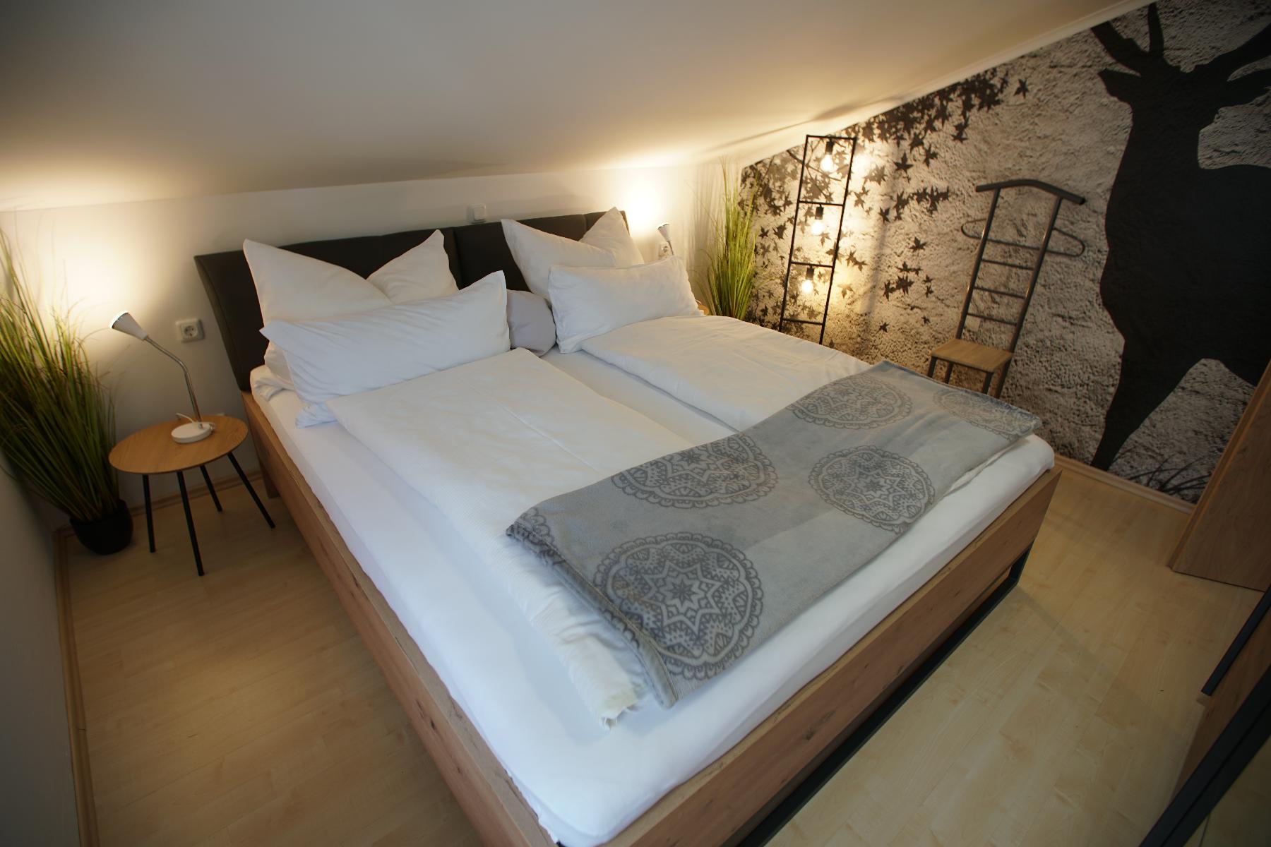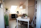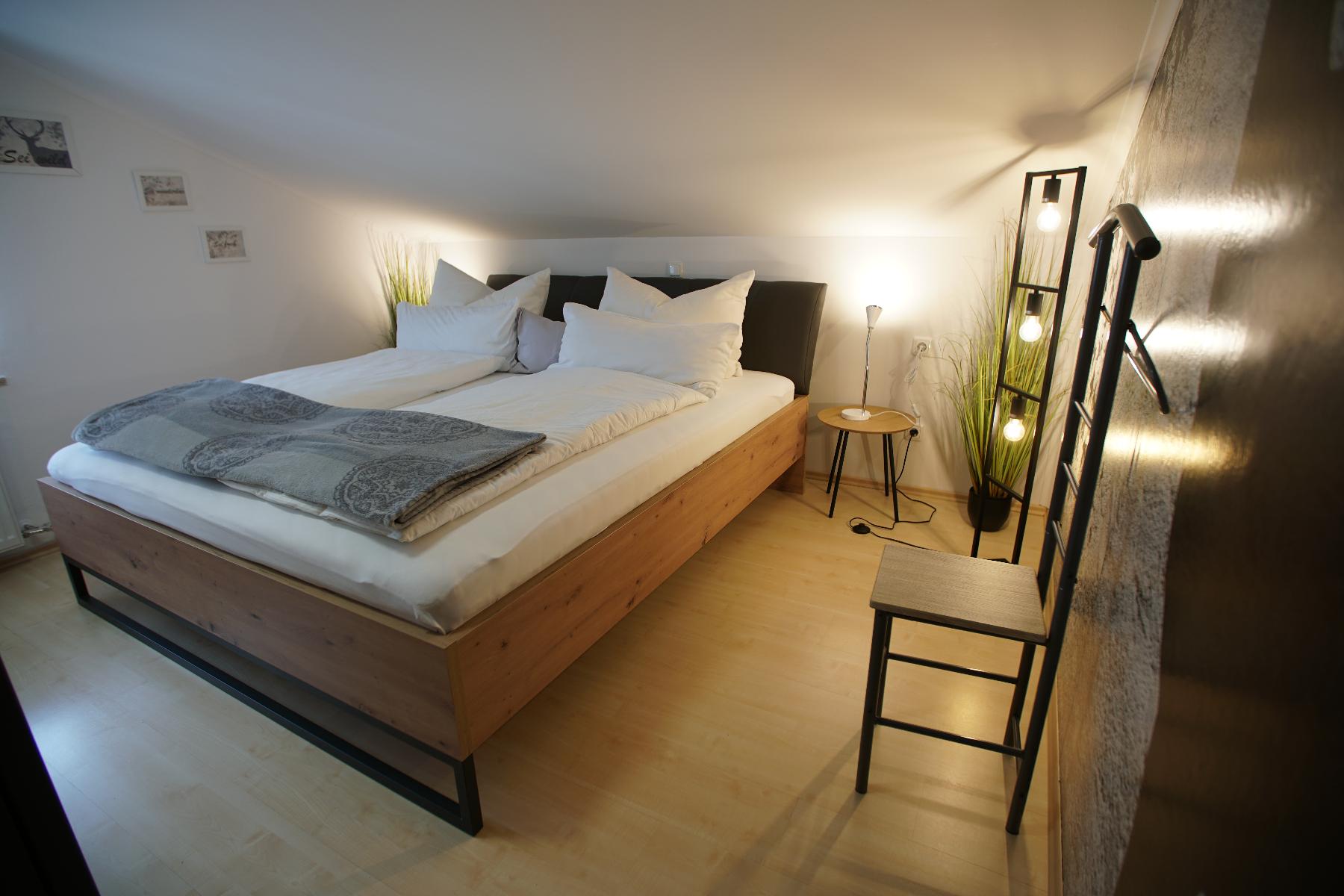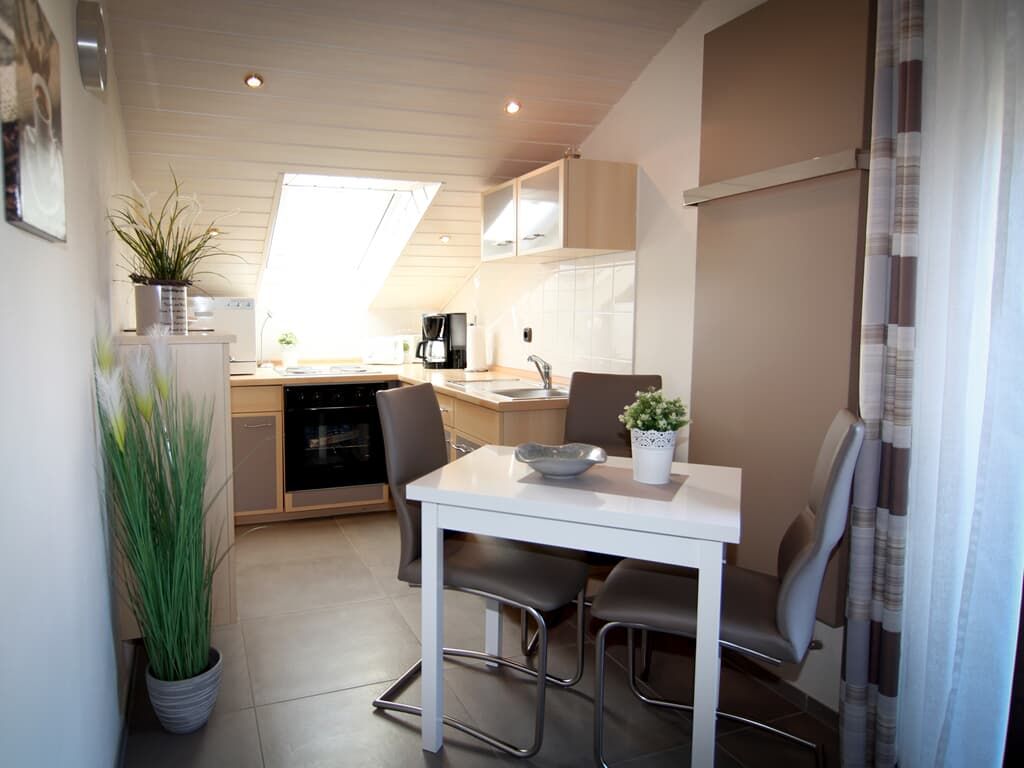 Ein romantisches Appartement unter dem Dach bieten wir unseren Gästen in der oberen Etage des Hauses an. Die Wohnung verfügt über eine schöne, gemütliche Wohnküche mit Zugang zum Balkon, zwei Doppelschlafzimmer sowie ein schnuckeliges Badezimmer in der Mansarde mit Dusche und WC. Bade- und Handtücher mit Fön und Kosmetikspiegel gehören ebenso dazu.