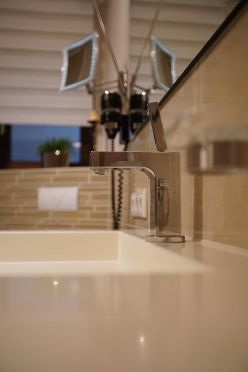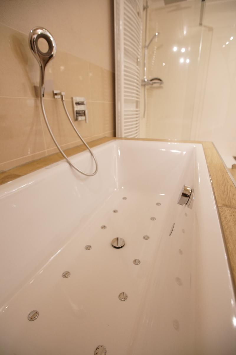 Ein luxuriöses Badezimmer mit Whirlpool, begehbarer Dusche, WC, beleuchteten Kosmetikspiegel und vielen mehr lädt dazu ein, die Seele baumeln zu lassen. Ein Gäste-WC befindet sich gleich im Nebenraum.