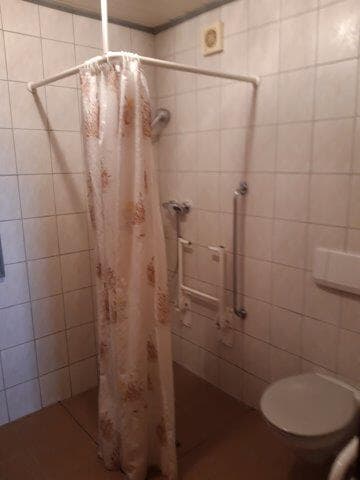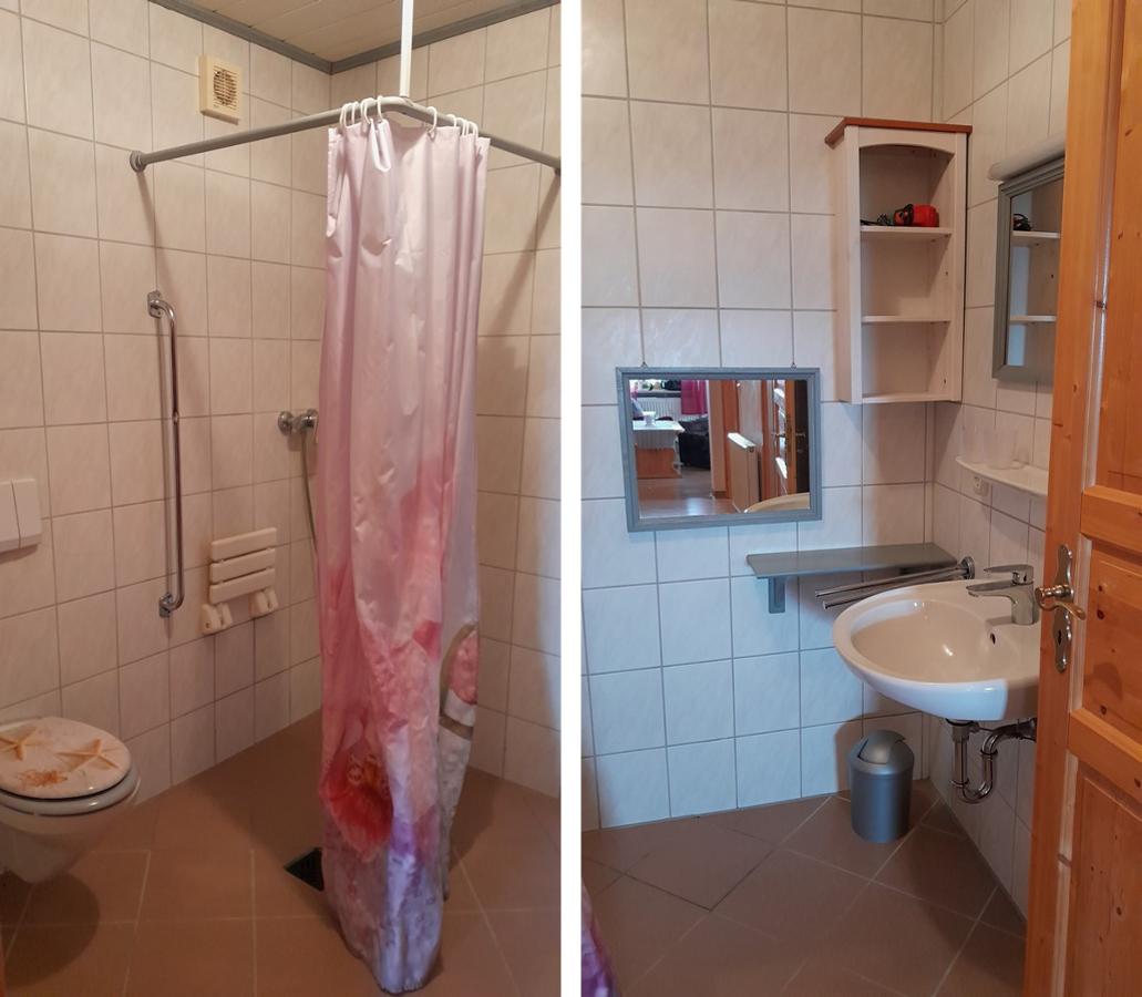 In der Wohnung befinden sich zwei Schlafräume, wovon eines als Elternschlafzimmer mit einem Doppelbett und eines als Kinderzimmer mit Etagen- und Einzelbett, eingerichtet sind. Das Bad ist mit rollstuhlgerechter Dusche und WC ausgestattet. Direkt vor den Wohnungen können Autos geparkt werden. Die Wohnungen werden über eine breite, überdachte Terrasse erreicht. Diese lädt ein zum Frühstücken im Freien, zum nachmittäglichen Kaffeetrinken oder für gesellige Runden am Abend.
