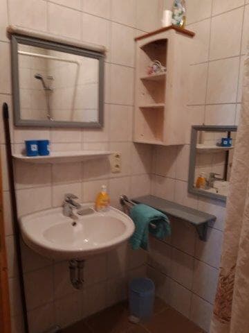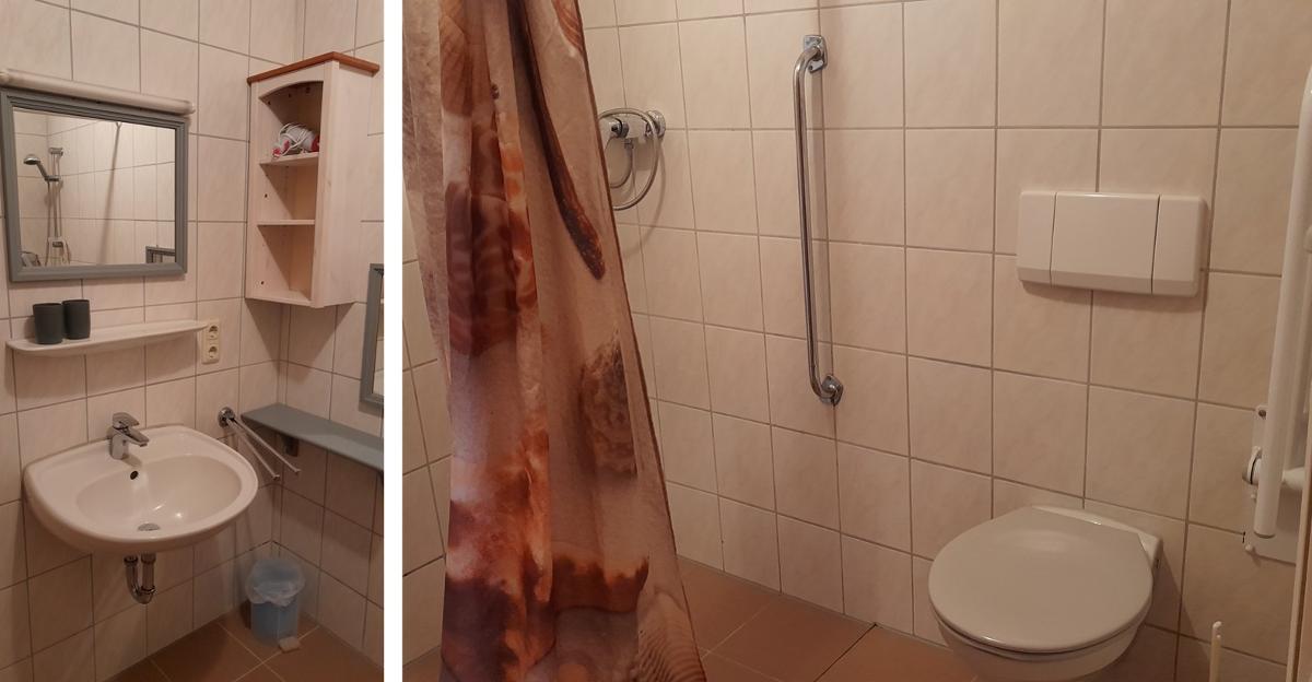 In der Wohnung befinden sich zwei Schlafräume, wovon eines als Elternschlafzimmer mit einem Doppelbett und eines als Kinderzimmer mit Etagen- und Einzelbett, eingerichtet sind. Das Bad ist mit rollstuhlgerechter Dusche und WC ausgestattet. Direkt vor den Wohnungen können Autos geparkt werden. Die Wohnungen werden über eine breite, überdachte Terrasse erreicht. Diese lädt ein zum Frühstücken im Freien, zum nachmittäglichen Kaffeetrinken oder für gesellige Runden am Abend.