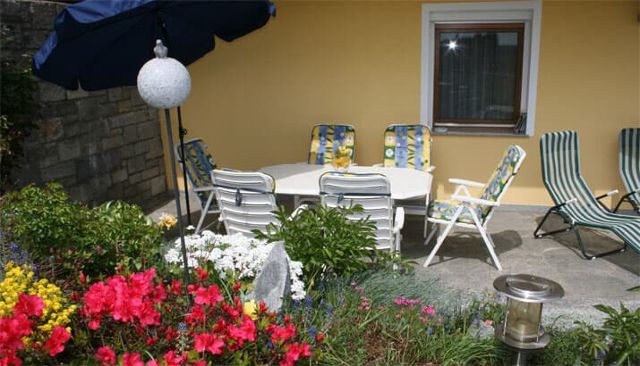 In unserer ebenerdigen Ferienwohnung im Haupthaus mit herrlicher Aussicht bieten wir Ihnen auf 70 qm für 2-5 Personen: 2 getrennte Schlafzimmer, Wohnküche mit TV-SAT-Anschluss, kompl. Bad, WC extra, Diele, Abstellraum, große Terrasse, Garten und Liegewiese, Grillmöglichkeit auf separater Terrasse, Autostellplatz vor dem Hause.