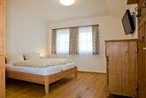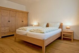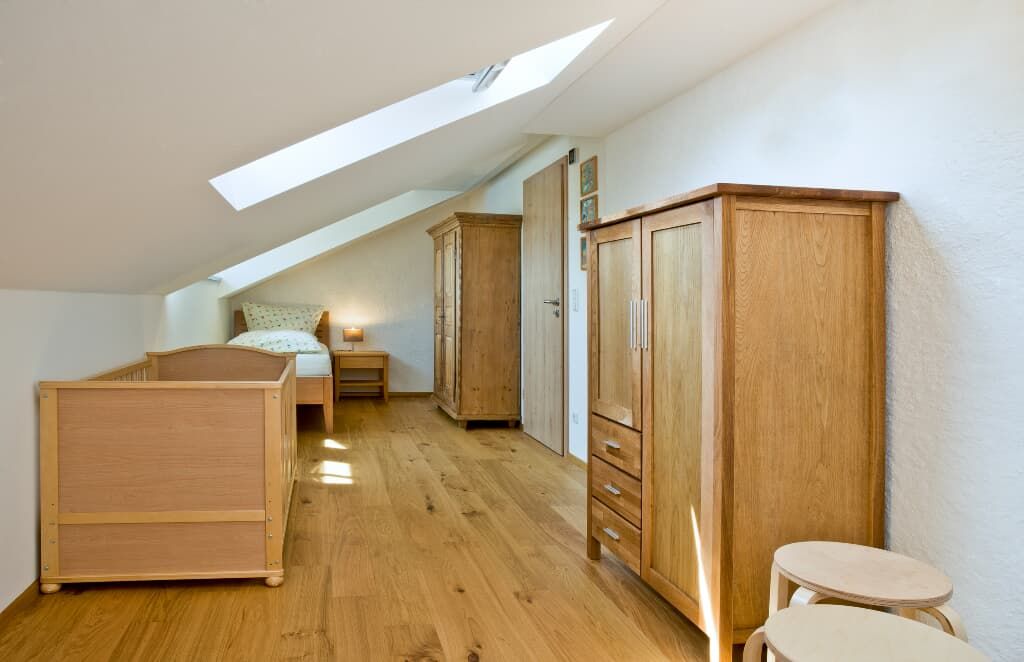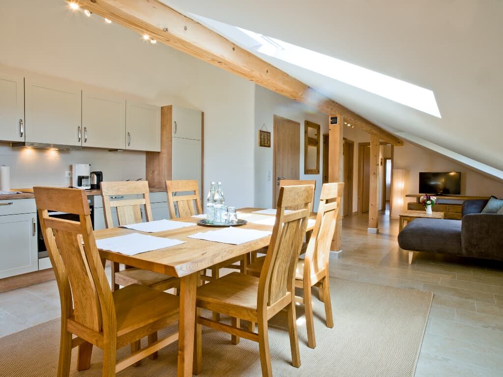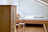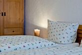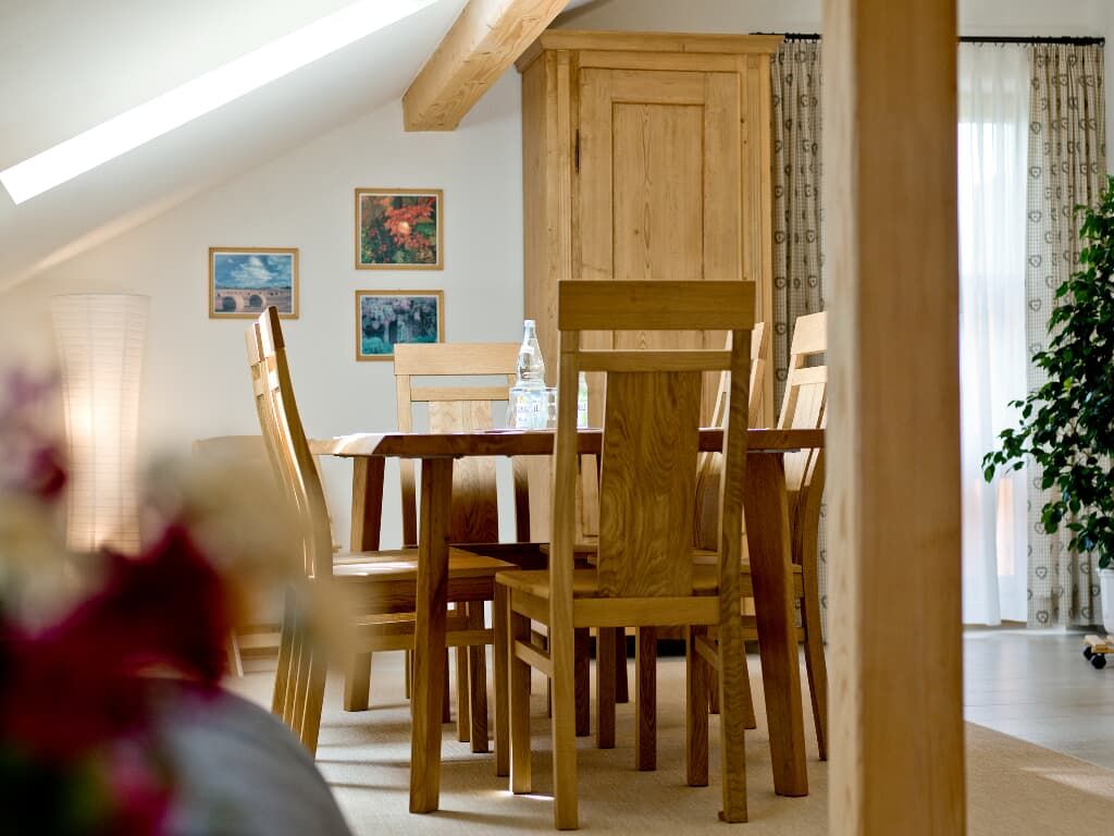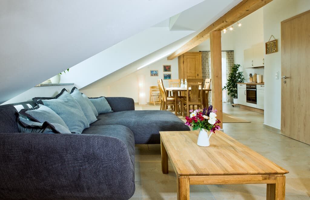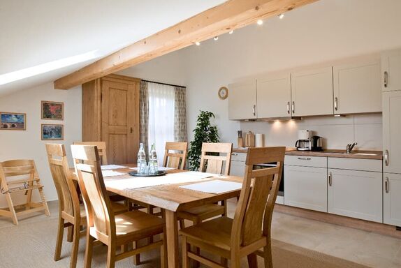 Ihre Ferienwohnung ist eine Mansardenwohnung und befindet sich im Haupthaus im 2. Stock. Die Wohnung verfügt über zwei separat begehbare Schlafräume. Die Wohnung verfügt über ein Badezimmer mit Dusche und WC und ein separates WC. Das große Wohnzimmer mit Küchenzeile verfügt über einen kleinen Balkon. Die Küche ist mit einer Spülmaschine, einem Ceranfeld mit Backofen und einem Kühlschrank mit Gefrierfach ausgestattet. Küchenkleingeräte sind ebenfalls vorhanden. Alle Betten sind mit Bettwäsche bezogen. Große und kleine Handtücher sind im Bad vorhanden.