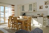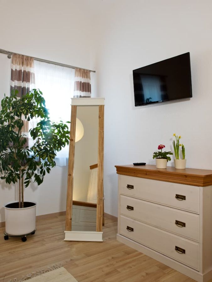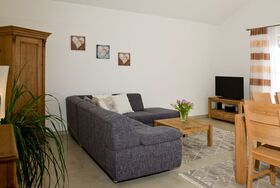 Ihre Ferienwohnung befindet sich im Nebengebäude im 1. Stock. Die Wohnung verfügt über drei separat begehbare Schlafräume, ein Badezimmer mit Dusche/WC und einem separatem WC. Die Wohnung hat ein großes Wohnzimmer mit Küchenzeile und Balkon. Die Küche ist mit einer Spülmaschine, einem Ceranfeld mit Backofen und einem Kühlschrank mit Gefrierfach ausgestattet. Küchenkleingeräte sind ebenfalls vorhanden. Alle Betten sind mit Bettwäsche bezogen. Große und kleine Handtücher sind im Bad vorhanden.