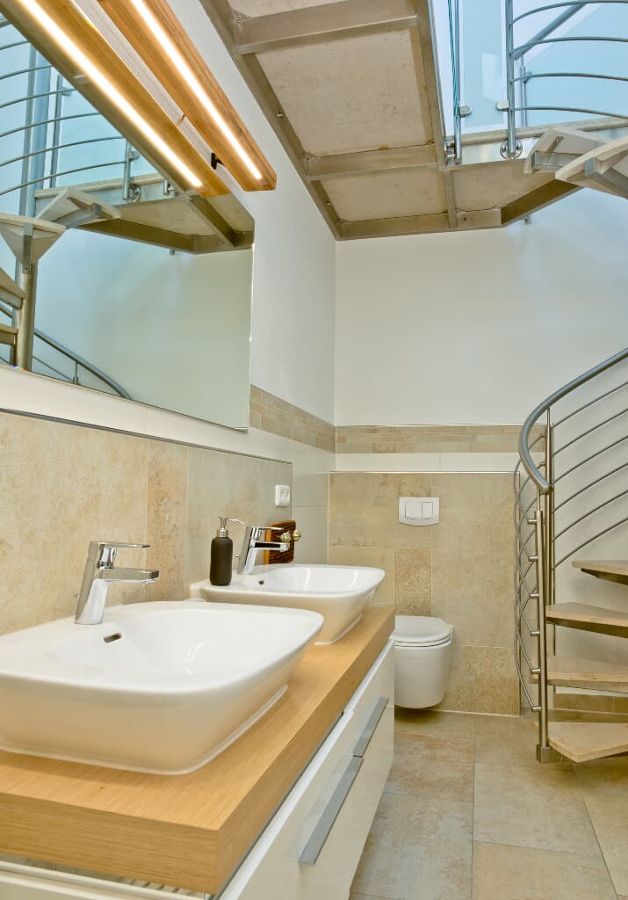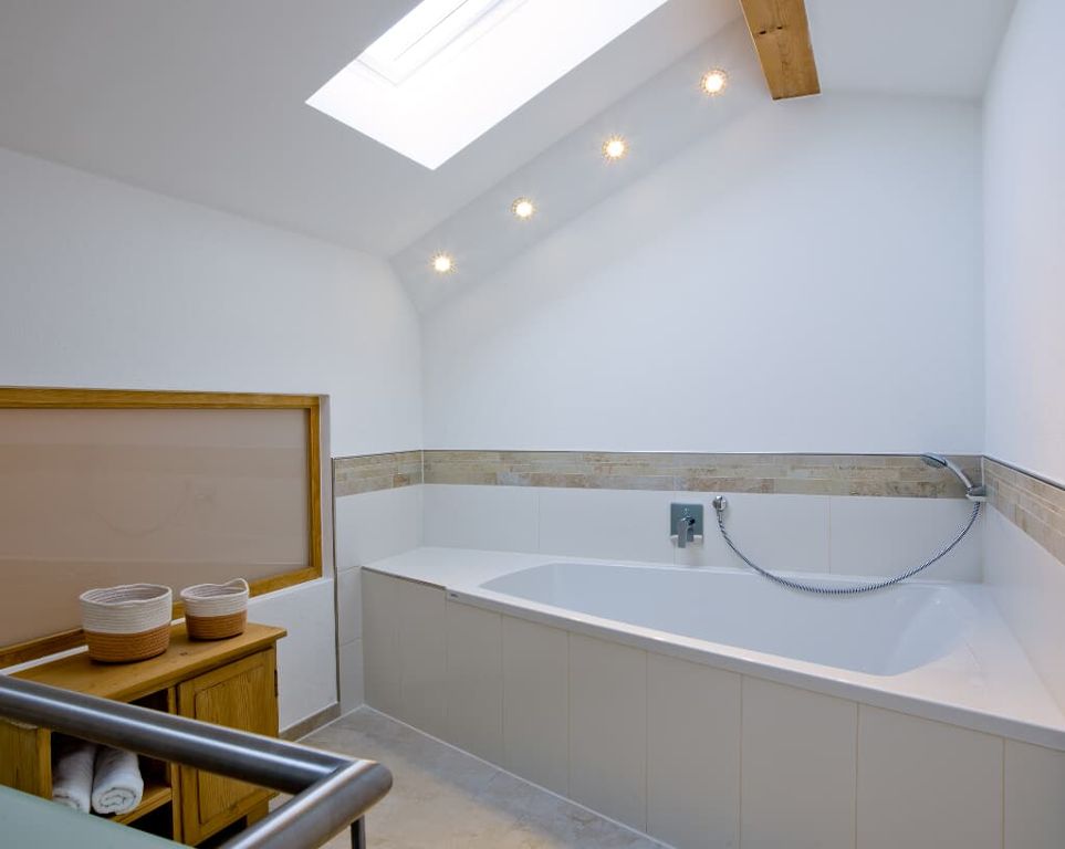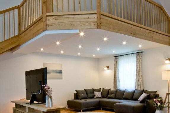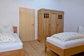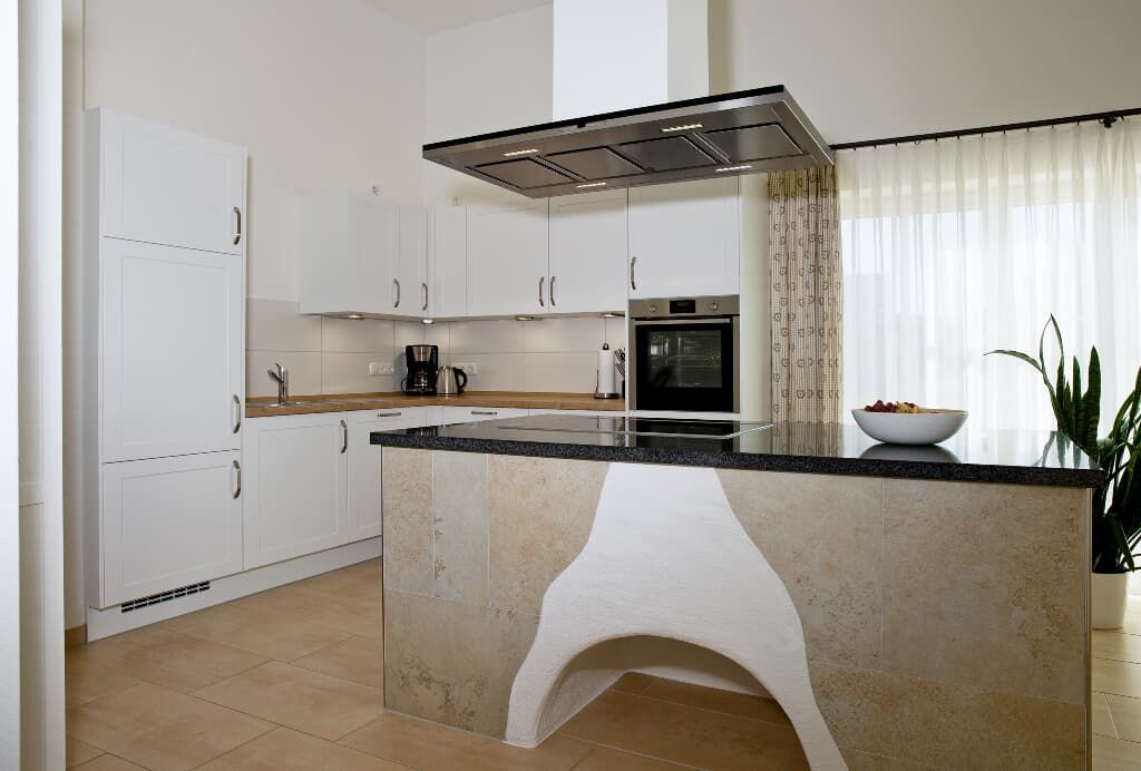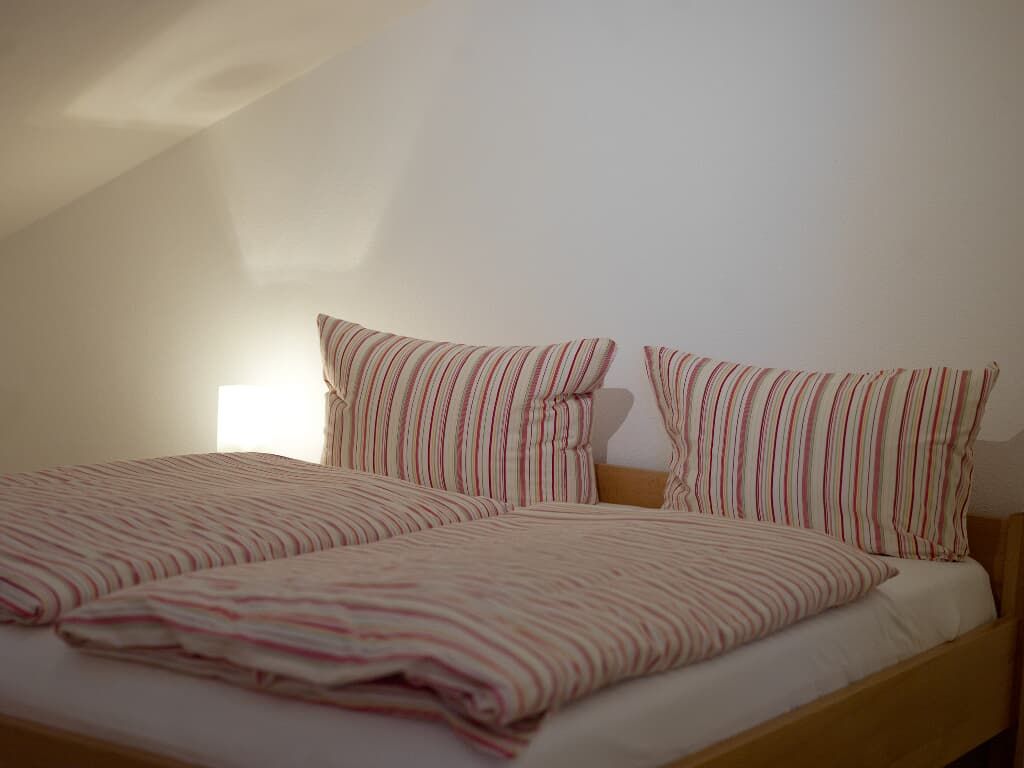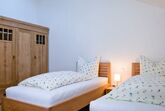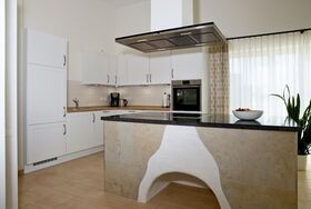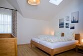 Ihre Ferienwohnung befindet sich im Nebengebäude im 1. Stock. Die Wohnung verfügt über zwei separat begehbare Schlafräume, ein Badezimmer mit Dusche/WC, Badewanne auf einer Empore und einem separatem WC. Die Wohnung hat ein großes Wohnzimmer (ca. 50m²) und eine große Küche und Balkon. Die Küche ist mit einer Spülmaschine, einer Kochinsel mit Ceranfeld, Backofen und einem Kühlschrank mit Gefrierfach ausgestattet. Küchenkleingeräte sind ebenfalls vorhanden. Alle Betten sind mit Bettwäsche bezogen. Große und kleine Handtücher sind im Bad vorhanden.