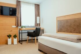 Unser stilvoll eingerichtetes Einzelzimmer mit Teppichboden ist etwa 15 Quadratmeter groß. Im bequemen Doppelbett mit orthopädischer Matratze haben Sie einen erholsamen Schlaf. Des Weiteren verfügt das Zimmer über einen Schreibtisch und einen Flachbild-TV mit Kabelprogramm. Das moderne Badezimmer ist einer Regendusche, einem WC und einem Waschbecken ausgestattet. Kostenfreies WLAN empfangen Sie im gesamten Zimmer