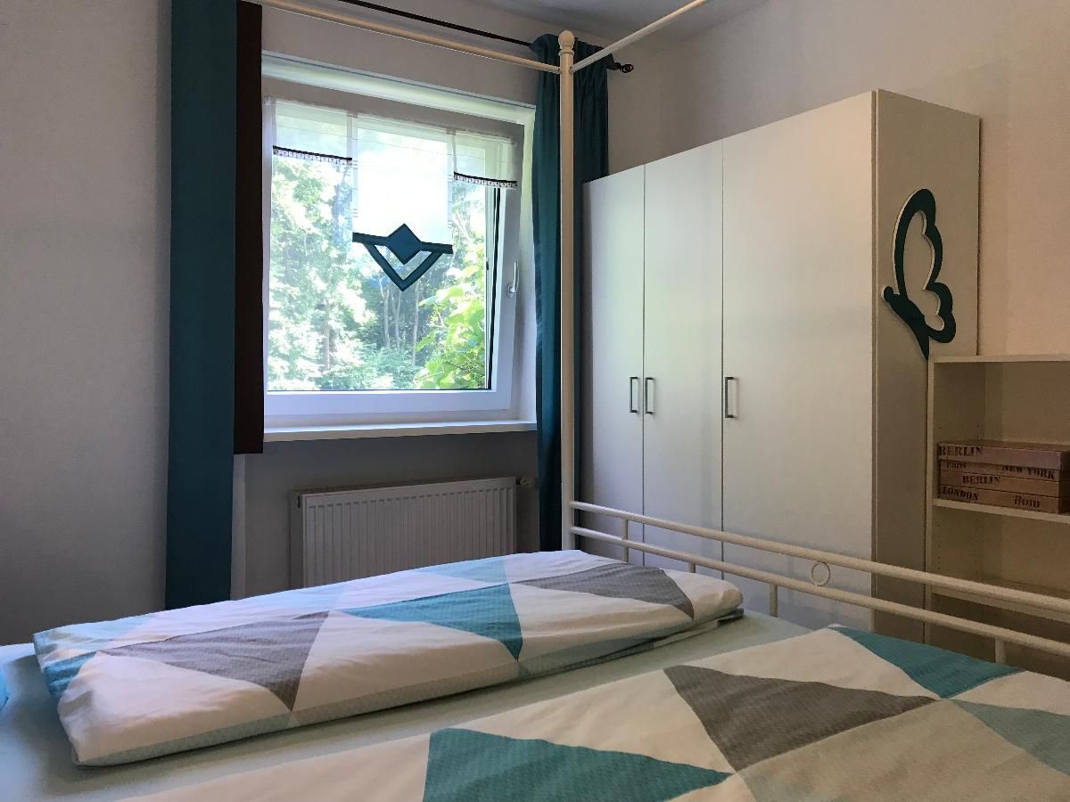 Das Schlafzimmer mit Doppelbett (1,80x2,00m) hat etwa 11qm und Blick in den Garten, das Wohnzimmer mit TV und DVD-Player bietet die Möglichkeit eines 3.Schlafplatzes auf der ausziehbaren Couch.