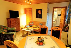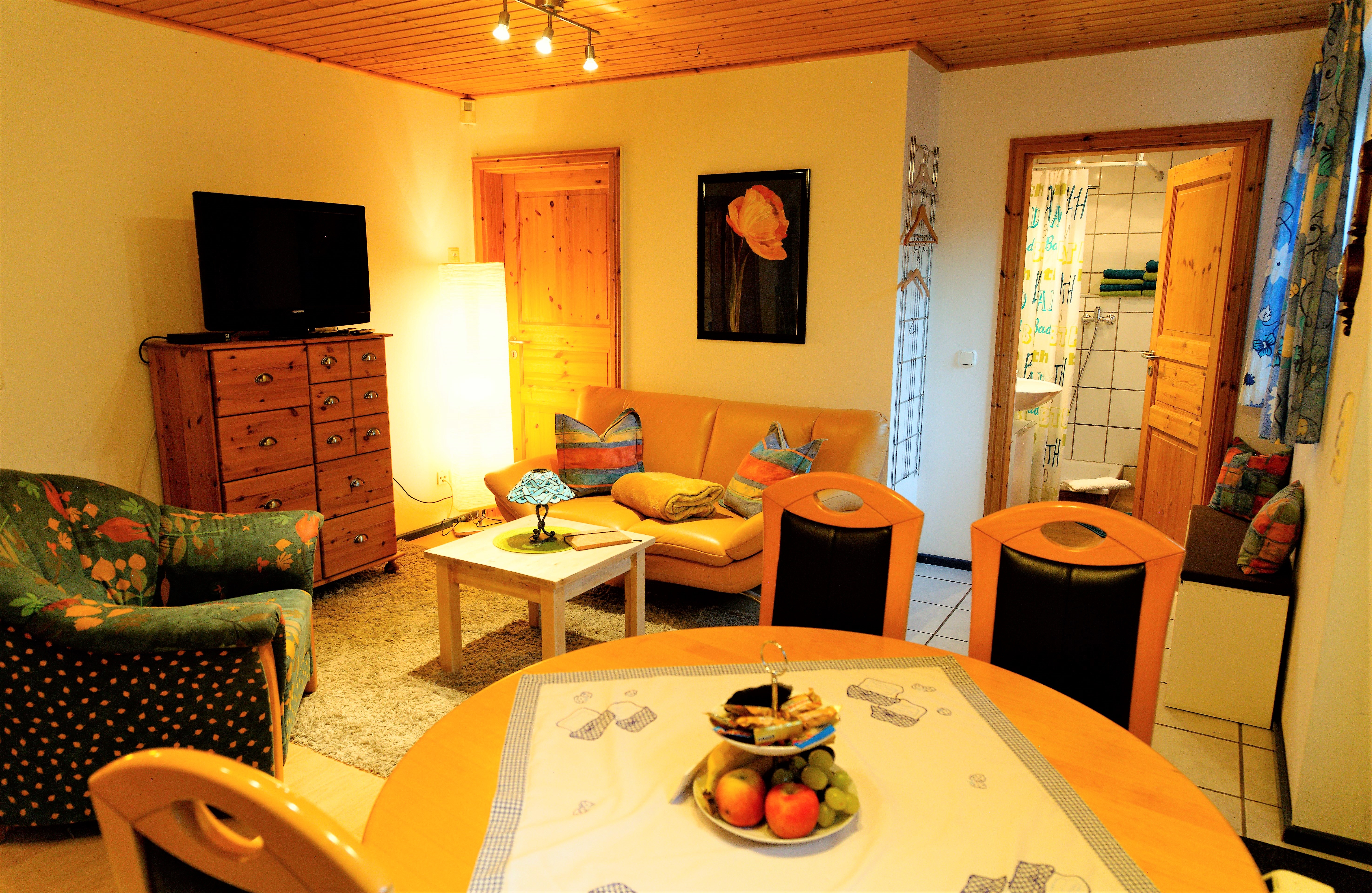 Der gemütliche Wohn- und Essbereich mit Sofa,-Satelliten- TV, Radio und Esstisch läd zu Verweilen ein.