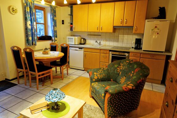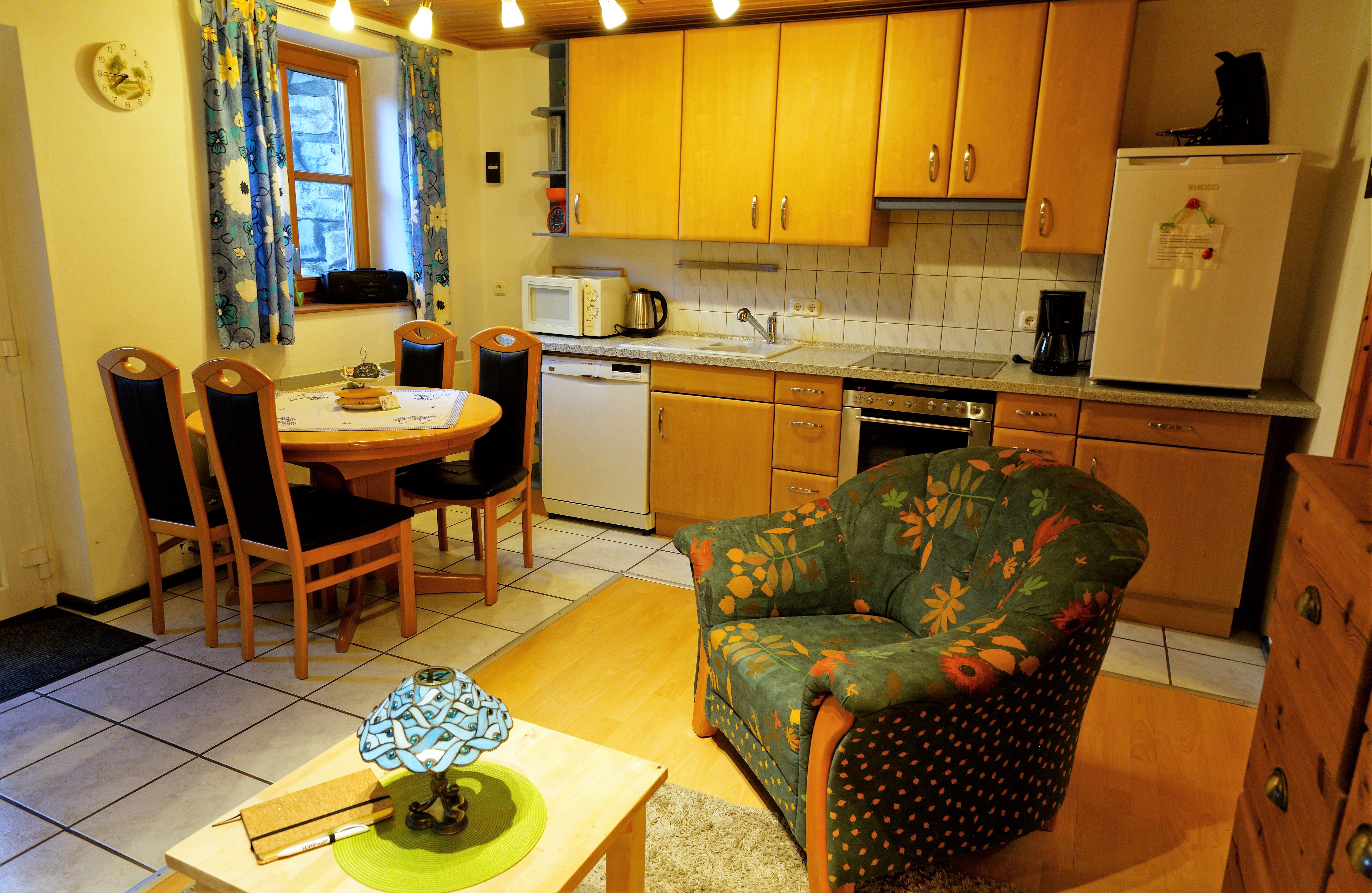 Sie verfügt über eine voll eingerichteten Küchenzeile mit Backofen, Mikrowelle, Toaster, Spülmaschine, Kaffeemschine und Kühlschrank mit 3* Gefirefach,
