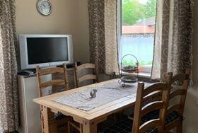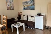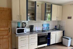 - sehr gut ausgestattete Wohnküche mit Schlafcouch und großem Eßbereich mit TV