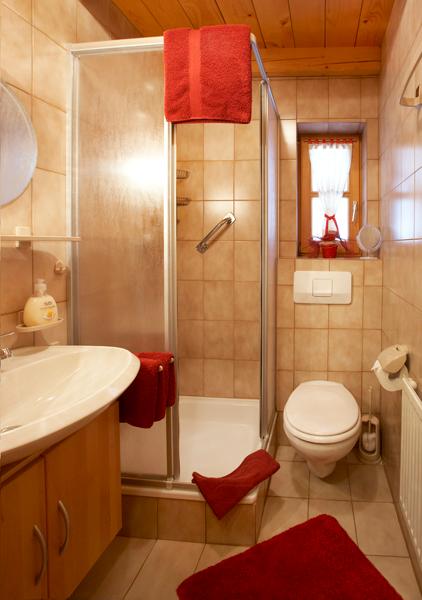 Dusche/WC mit Fön und Kosmetikspiegel.