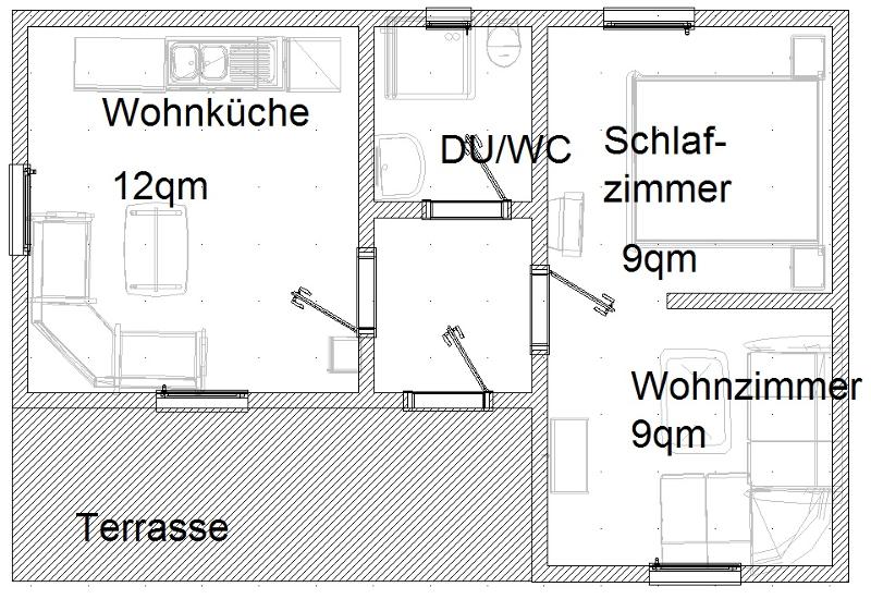 Unser romantisches Ferienhaus ist ca. 35 qm groß und verfügt über eine komplett ausgestattete Wohnküche, Wohn-Schlafraum mit Sat/TV und Safe.