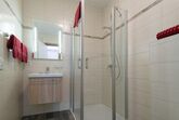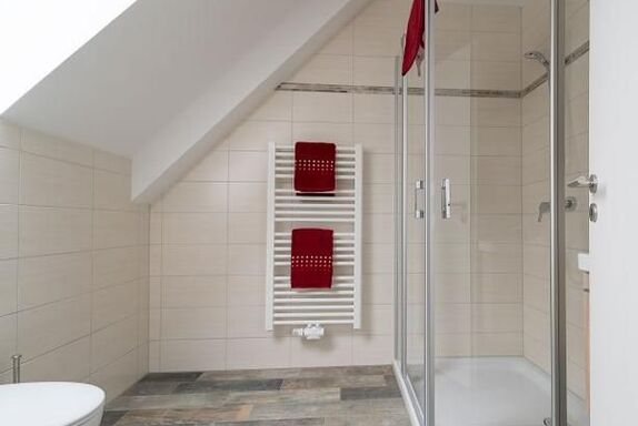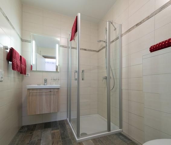 Das Badezimmer verfügt über Dusche/WC , Föhn und Kosmetikspiegel .