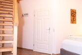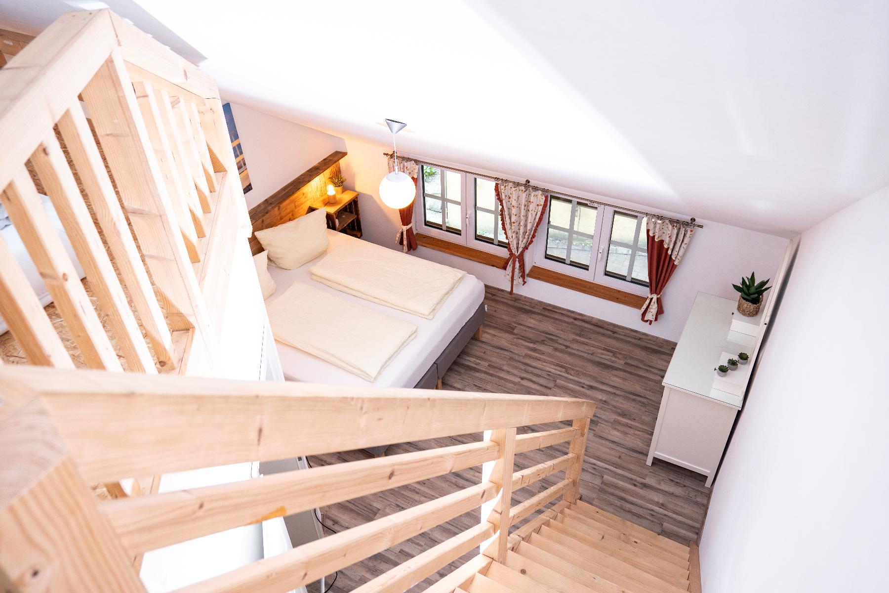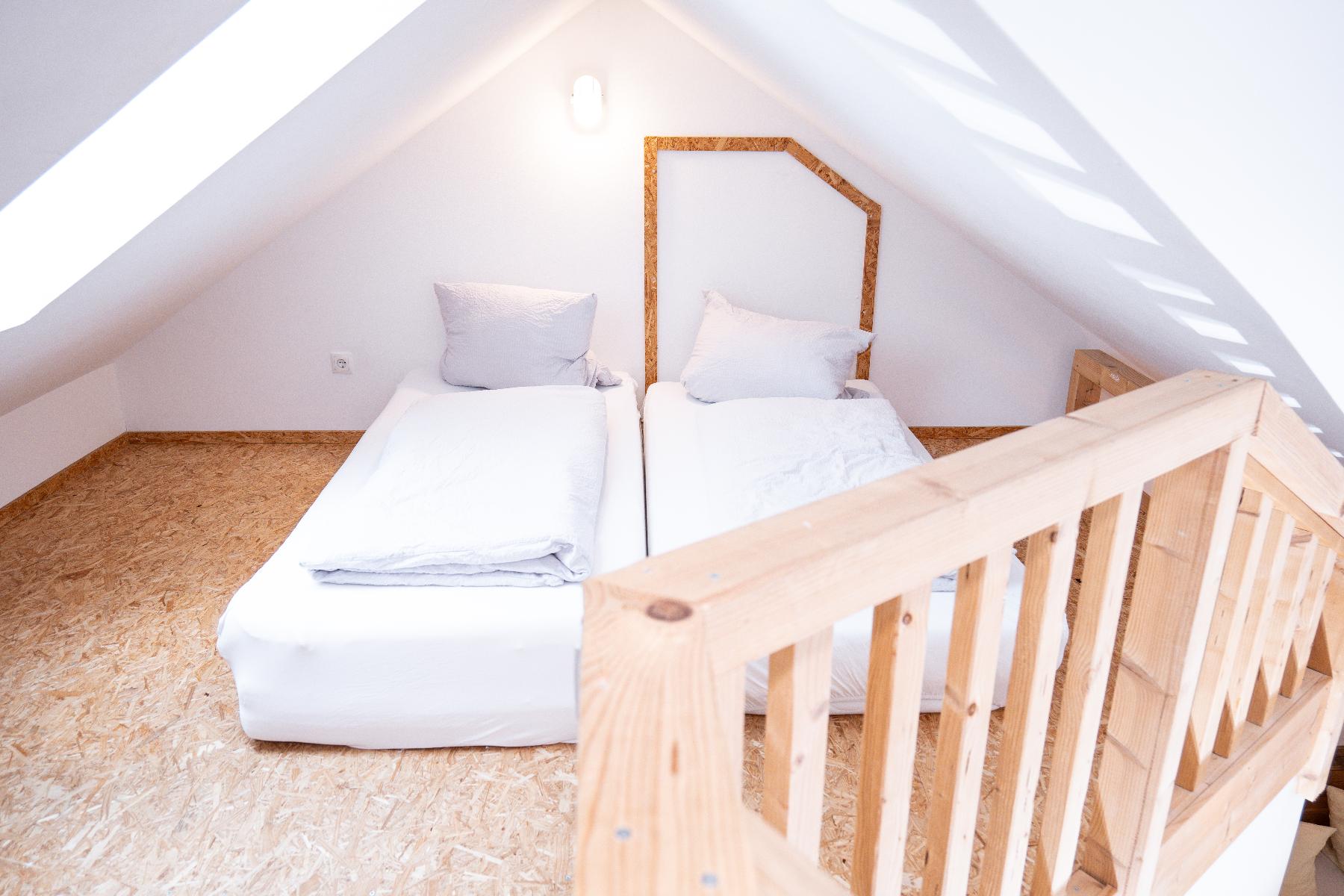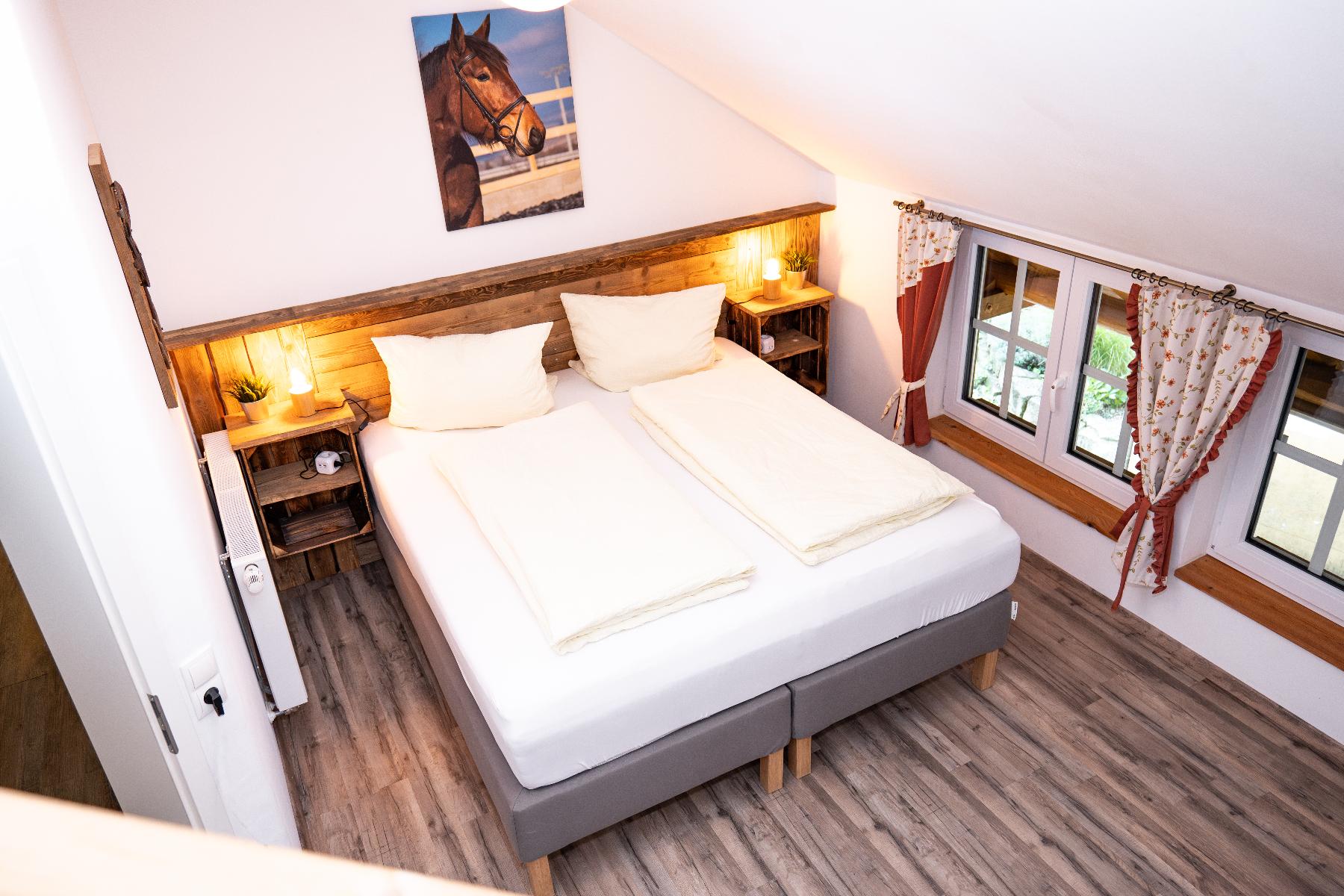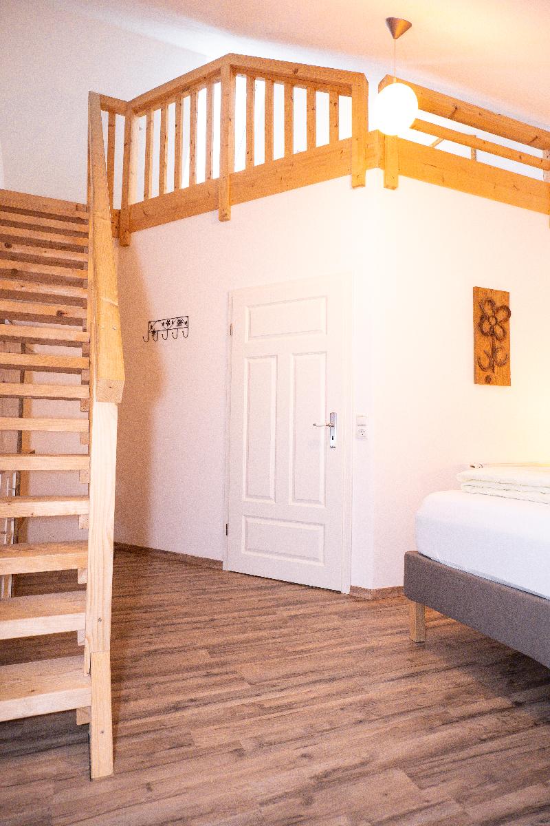5-Personen-Zimmer „Lilly“: Boxspring-Doppelbett (1,80×2,00m), 2 Matratzen auf der Empore