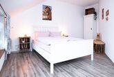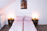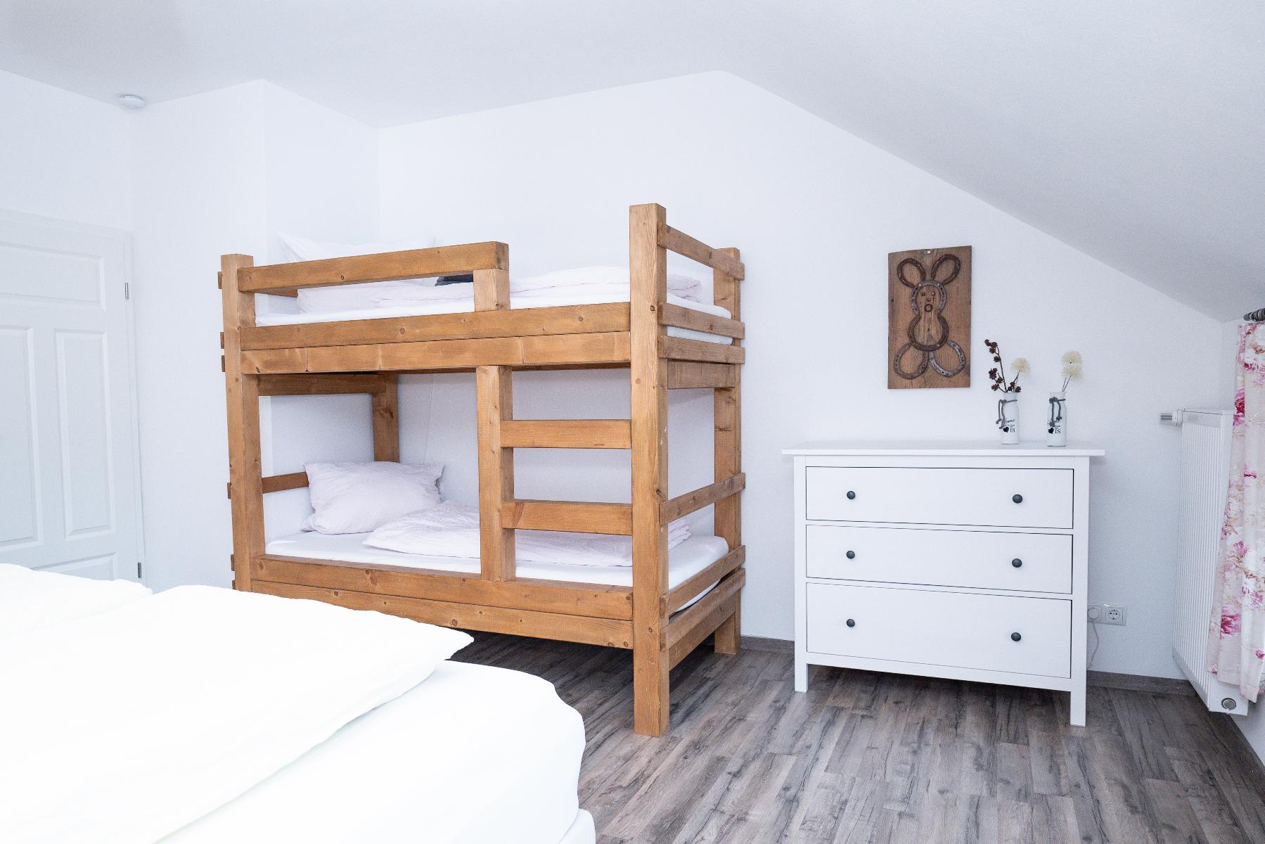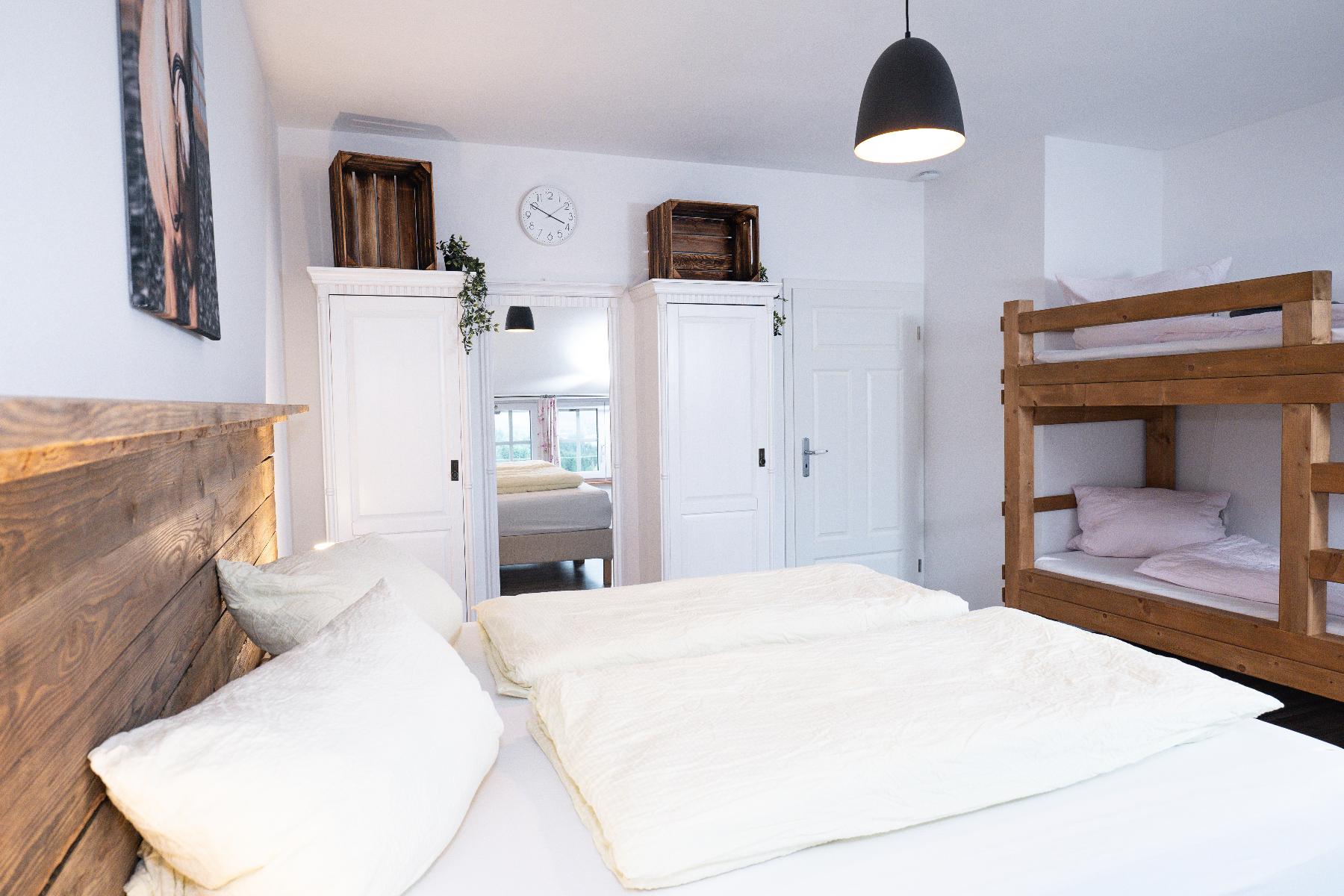 4-Bett-Zimmer „Fritzi“: Boxspring-Doppelbett (1,80×2,00m, kann als 2 Einzelbetten gestellt werden) und Etagenbett (0,90×2,00m). Zusätzlich mit kleinem Tisch und Sitzgelegenheiten.
