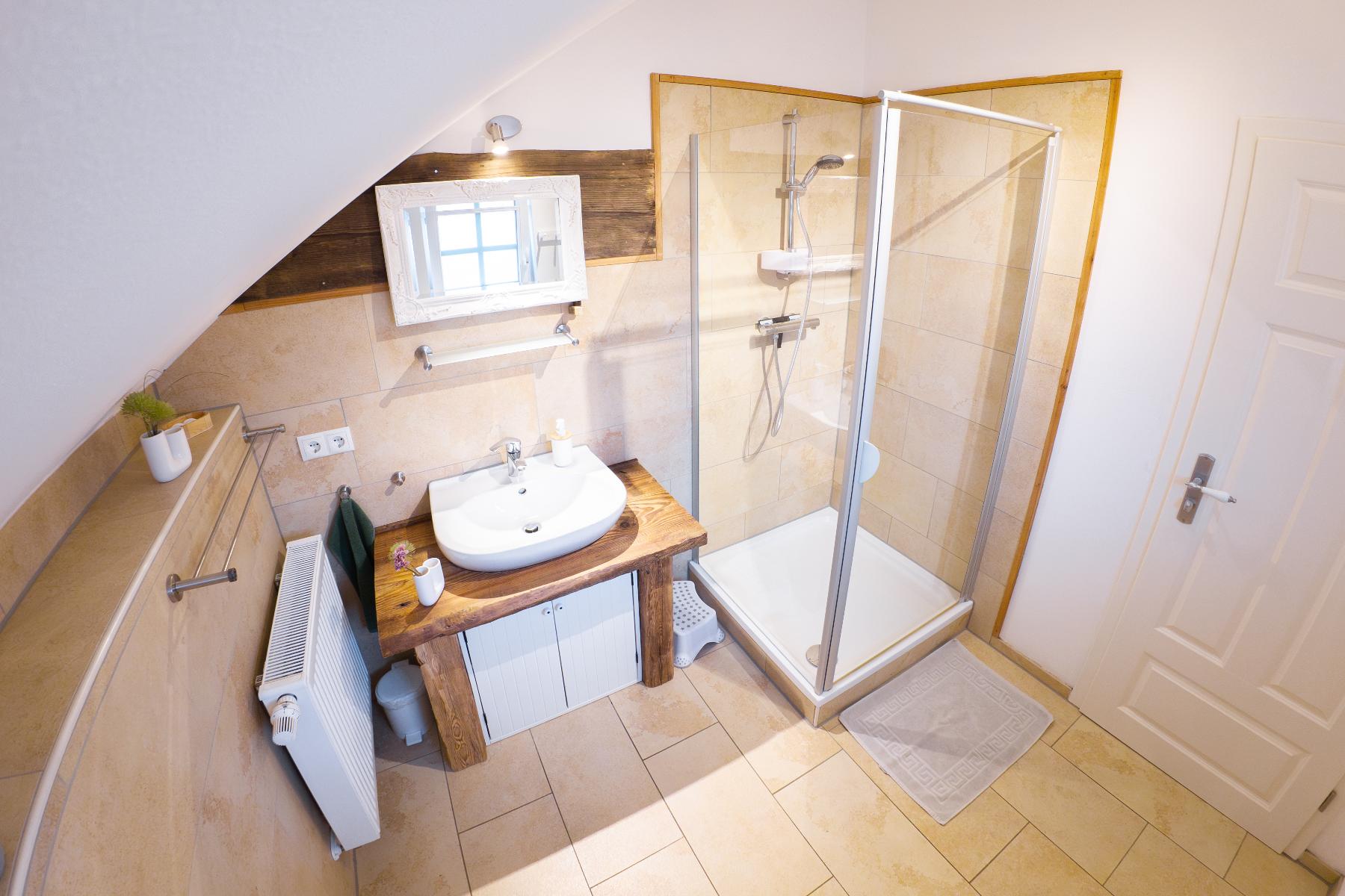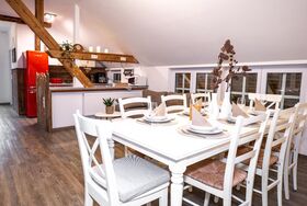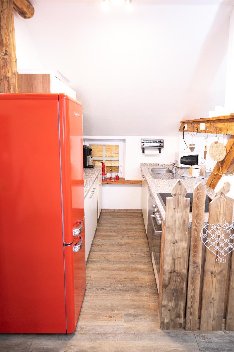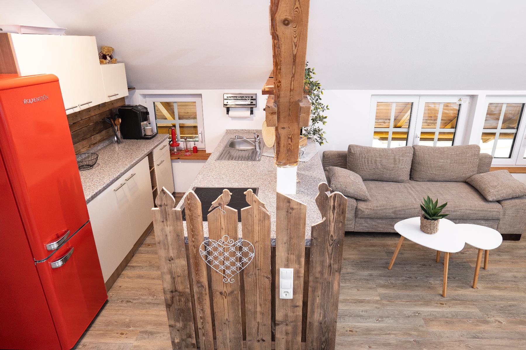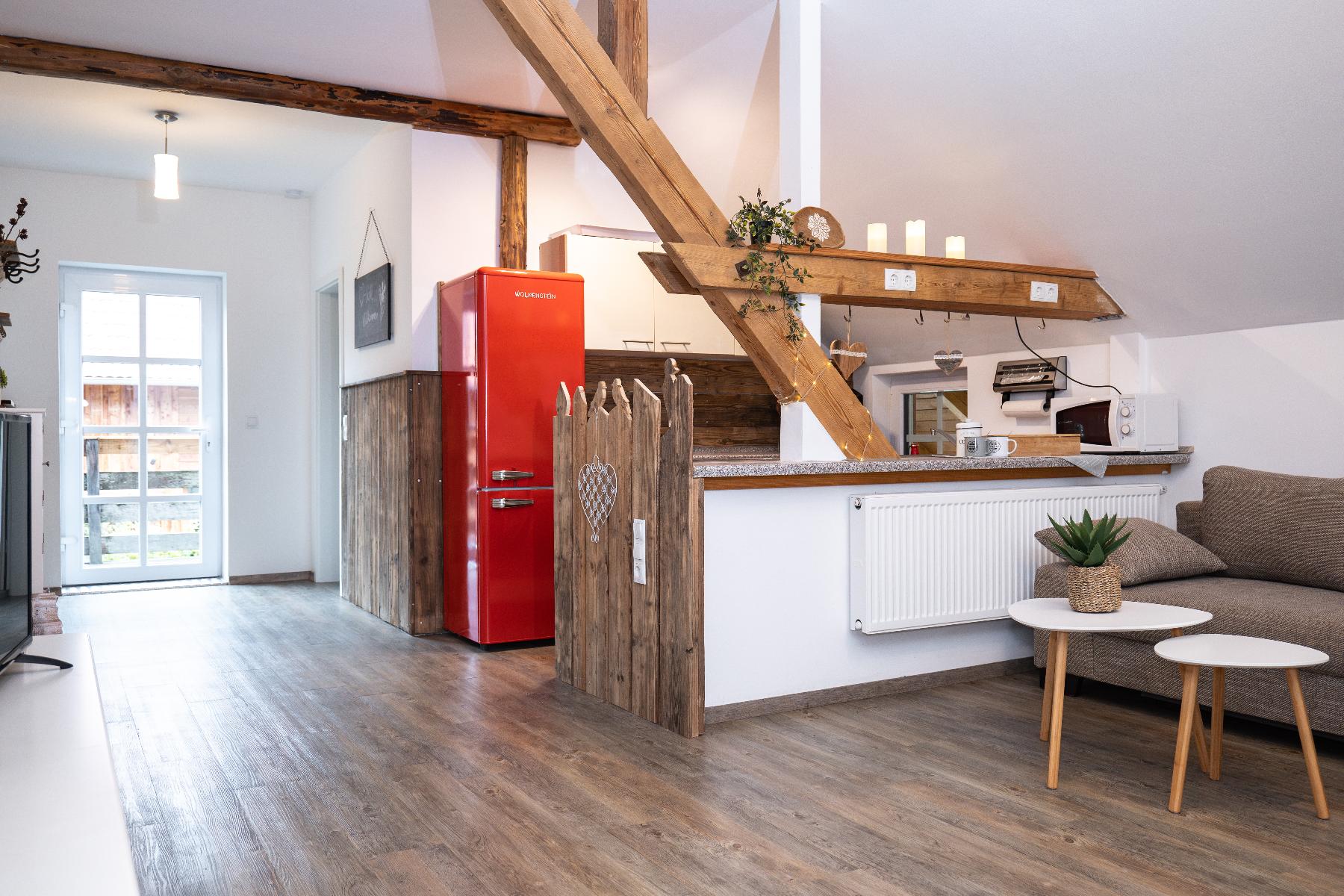 Sie liegt im 1. OG des Stallgebäudes und ist über den eigenen Balkon der Wohnung über eine Außentreppe (Gitterrost) zu erreichen. Die Wohnung verfügt über ein Tageslichtbad mit Dusche, WC und Urinal. Eine Einbauküche sowie ein großzügiger Wohn- und Essbereich mit Sat-TV, lädt zum Kochen und gemütlichen Zusammensitzen ein. In der Küche stehen Backofen und Kochfeld, Kaffeevollautomat, Kühlschrank, Toaster, Wasserkocher, Geschirrspüler und Radio zur Verfügung.