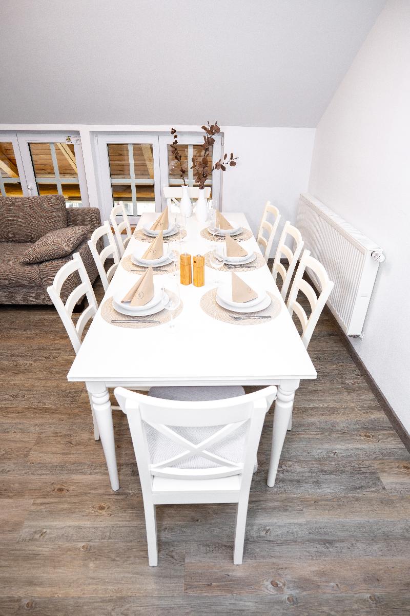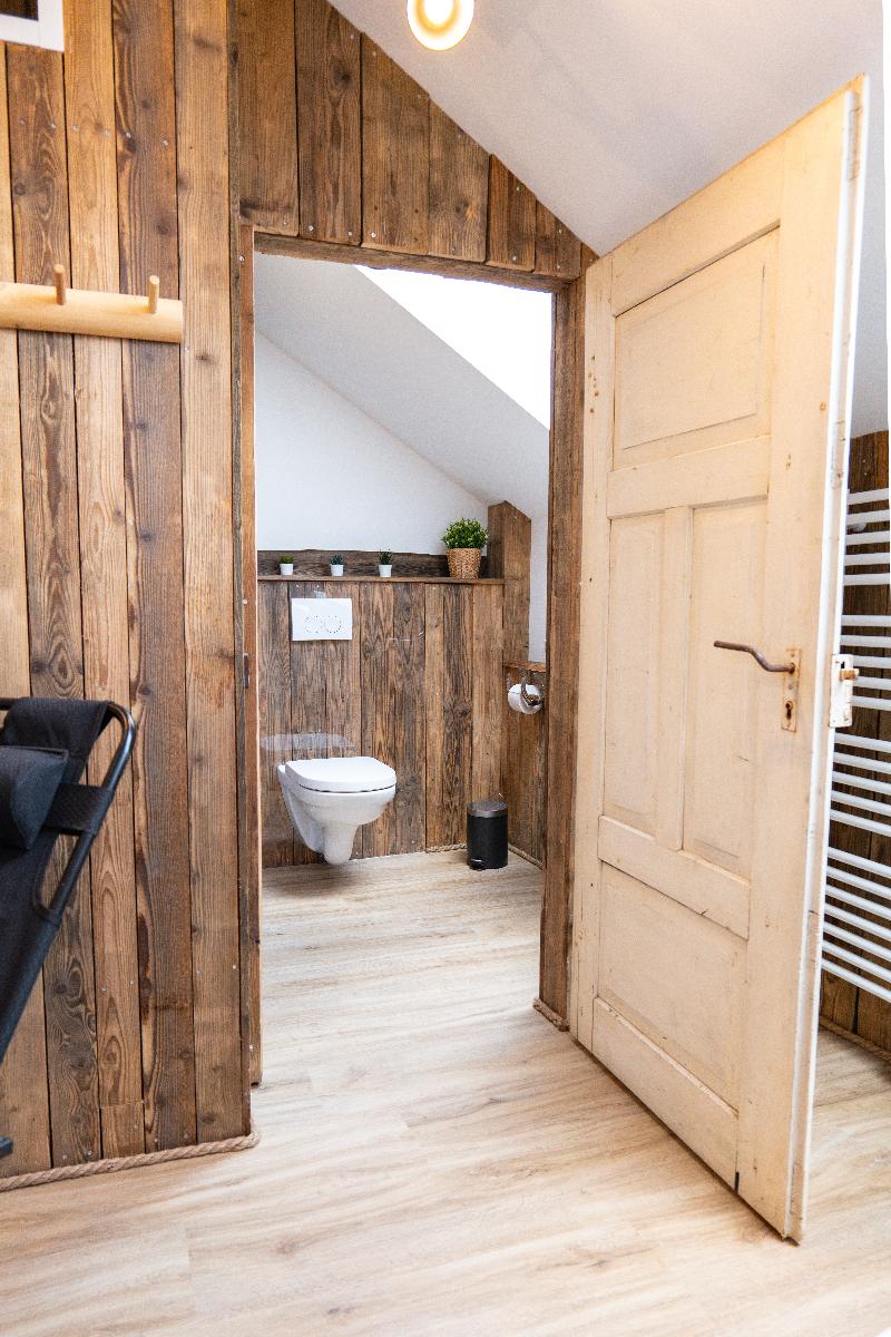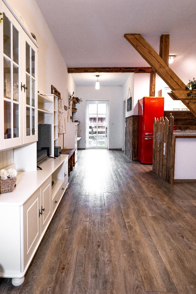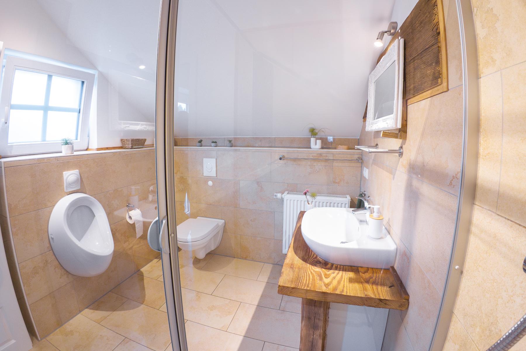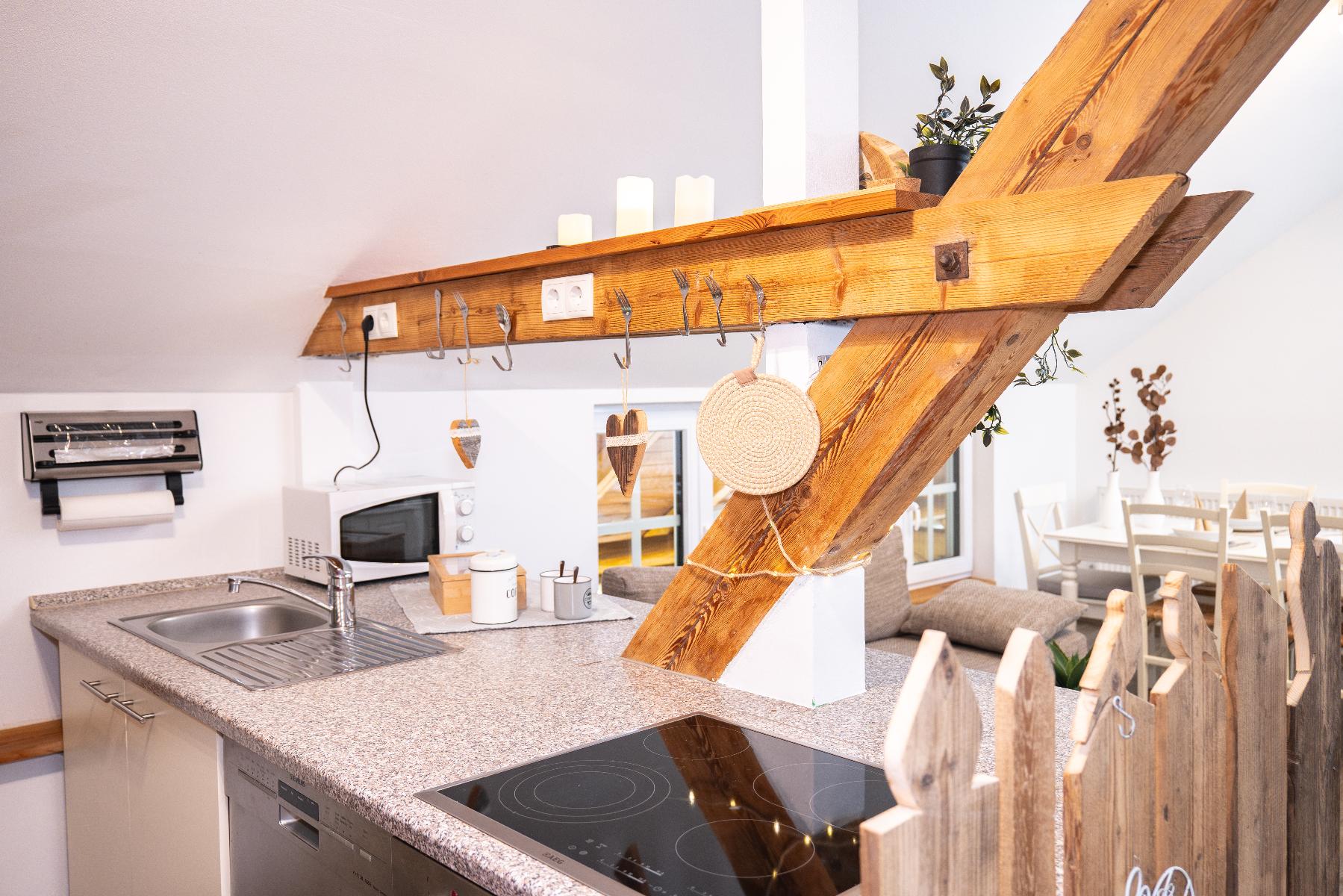 Sie liegt im 1. OG des Stallgebäudes und ist über den eigenen Balkon der Wohnung über eine Außentreppe (Gitterrost) zu erreichen. Die Wohnung verfügt über ein Tageslichtbad mit Dusche, WC und Urinal. Eine Einbauküche sowie ein großzügiger Wohn- und Essbereich mit Sat-TV, lädt zum Kochen und gemütlichen Zusammensitzen ein. In der Küche stehen Backofen und Kochfeld, Kaffeevollautomat, Kühlschrank, Toaster, Wasserkocher, Geschirrspüler und Radio zur Verfügung.