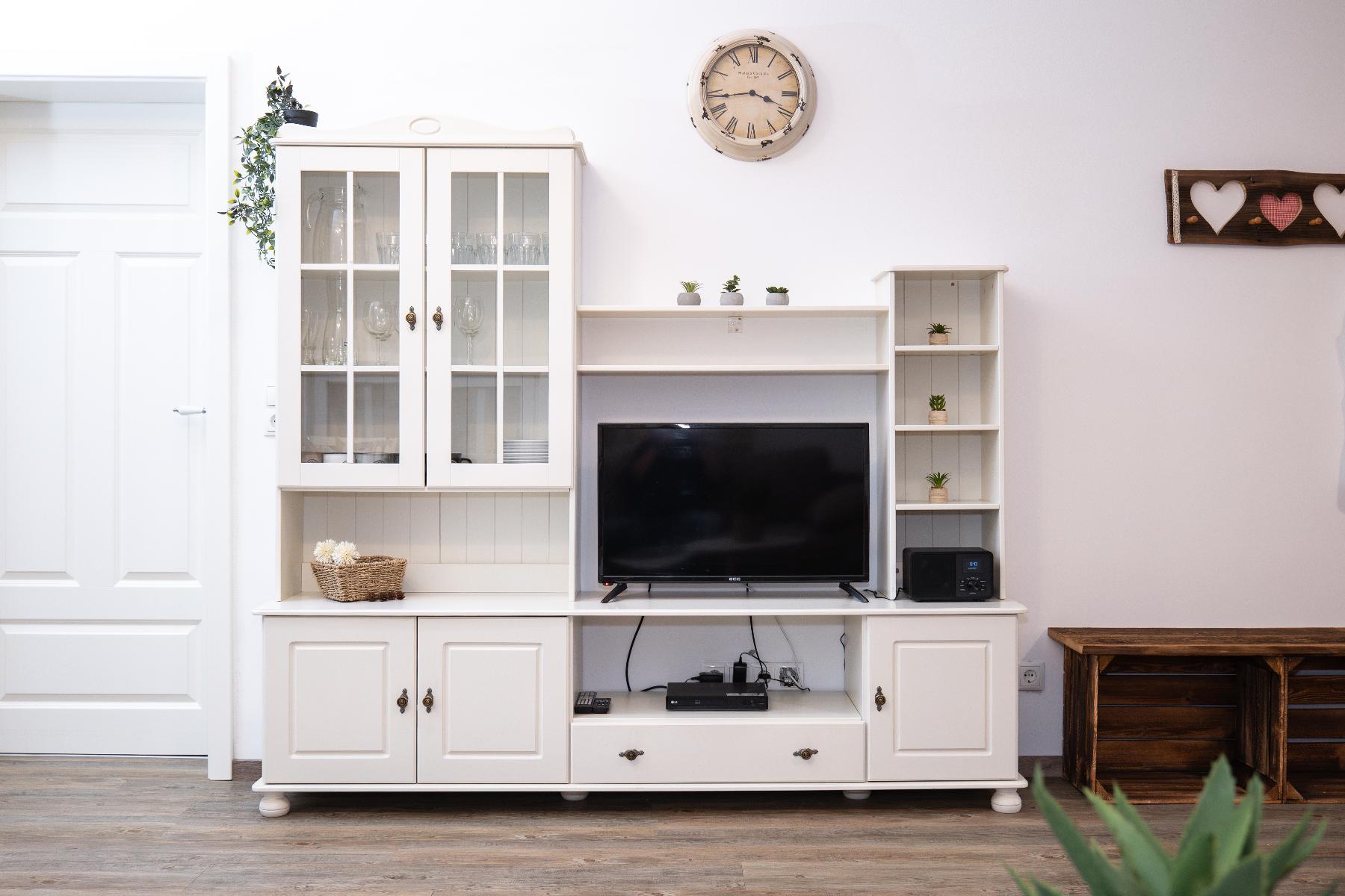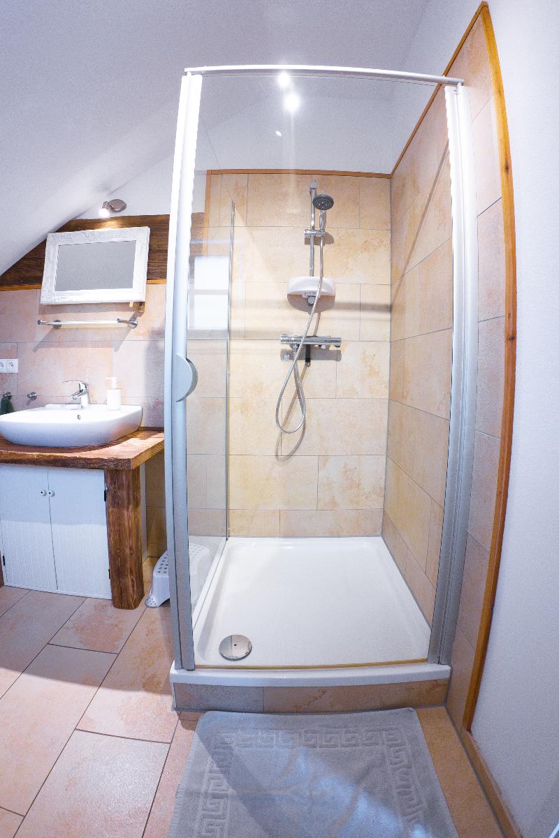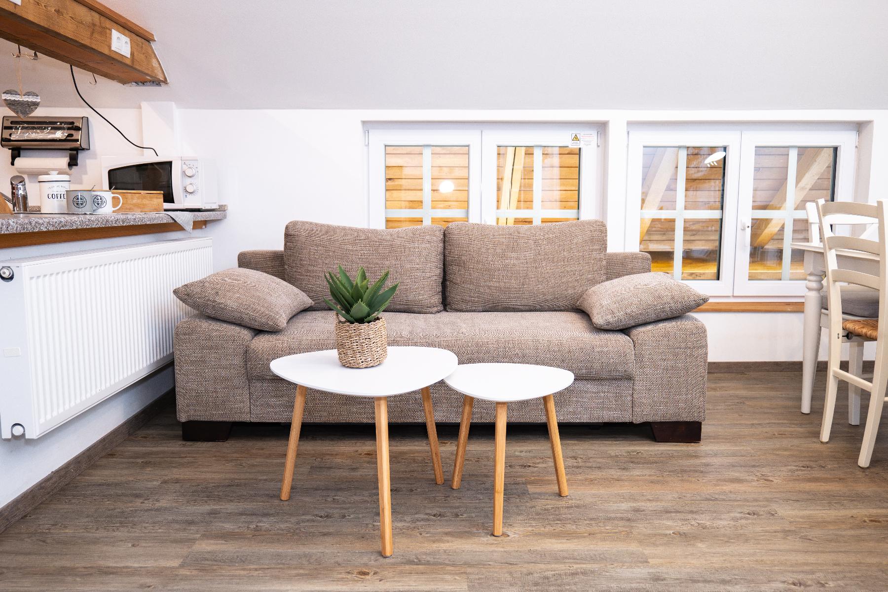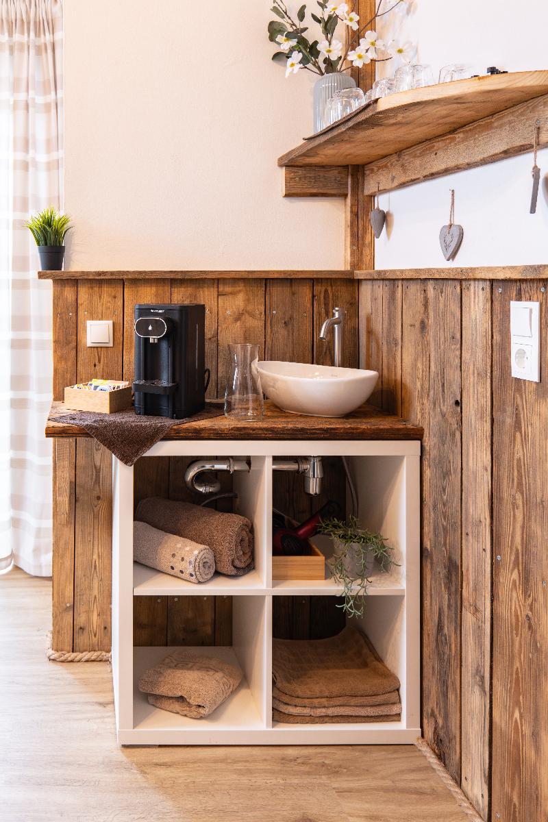 Sie liegt im 1. OG des Stallgebäudes und ist über den eigenen Balkon der Wohnung über eine Außentreppe (Gitterrost) zu erreichen. Die Wohnung verfügt über ein Tageslichtbad mit Dusche, WC und Urinal. Eine Einbauküche sowie ein großzügiger Wohn- und Essbereich mit Sat-TV, lädt zum Kochen und gemütlichen Zusammensitzen ein. In der Küche stehen Backofen und Kochfeld, Kaffeevollautomat, Kühlschrank, Toaster, Wasserkocher, Geschirrspüler und Radio zur Verfügung.