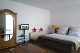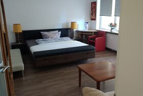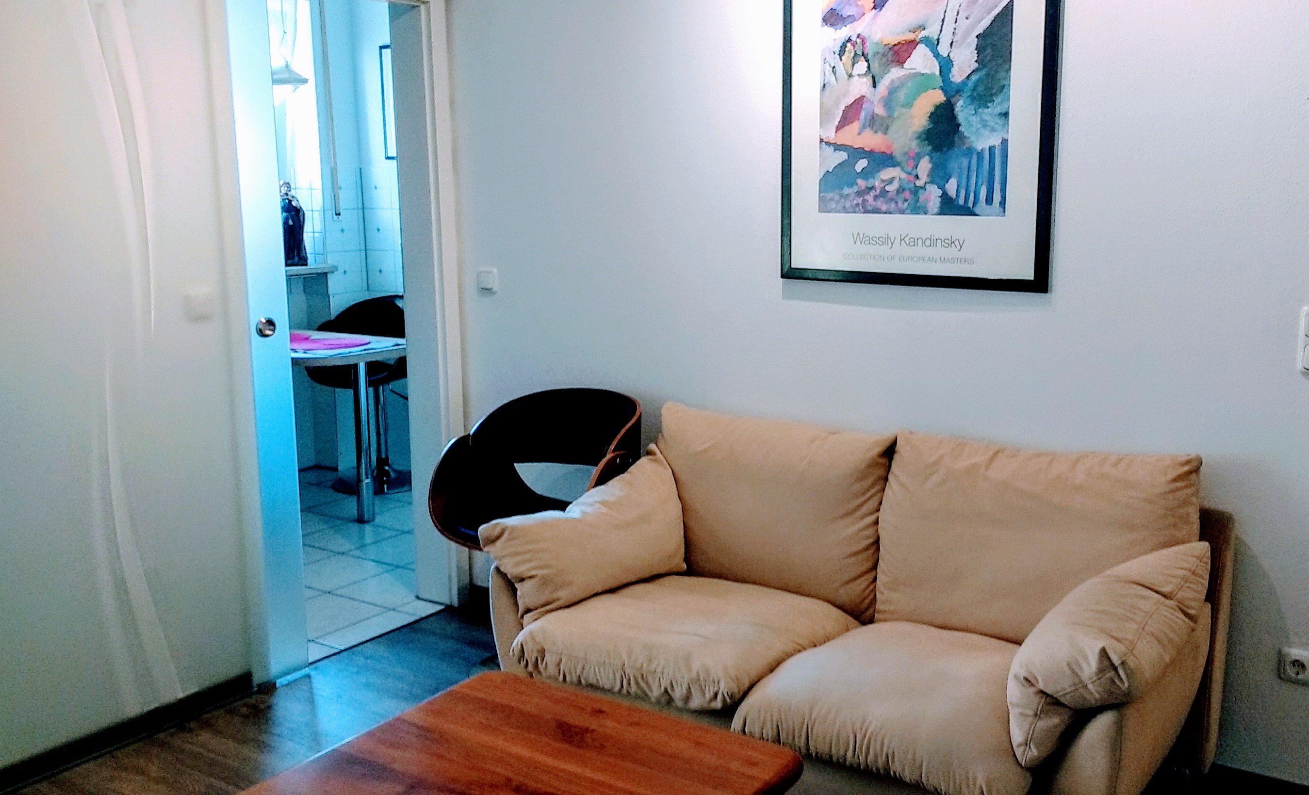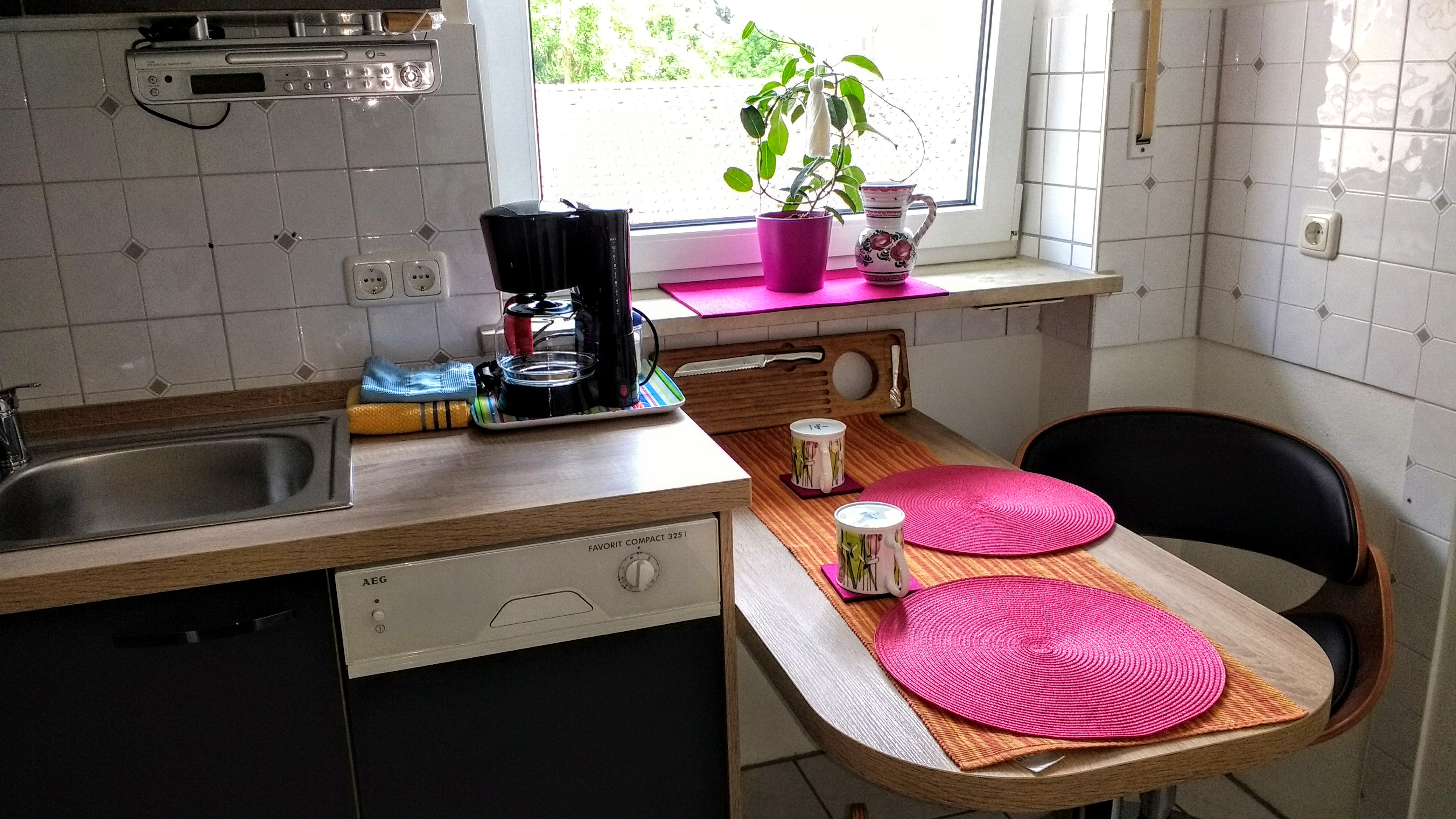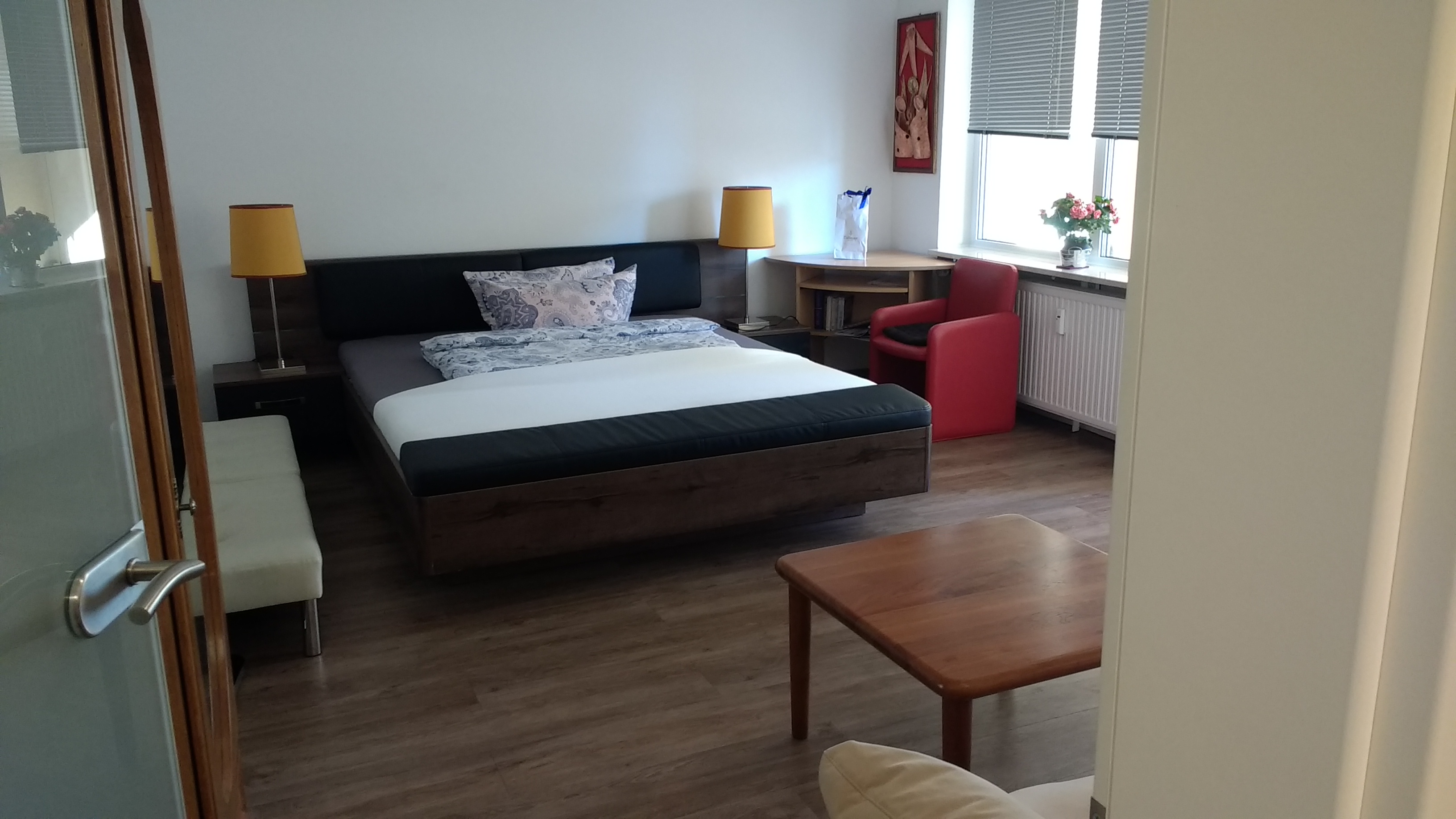 Die Wohnung ist möbliert mit einem modernen Doppelbett (1,80m x 2,00m) mit Fußbank, gemütlicher Doppelsitzer-Couch vollausgestatteter Küche mit Essbereich, Spülmaschine, Tee-, Kaffeemaschine, Wasserkocher, Kühl-Gefrierschrank mit 3 Sterne-Fach, außerdem Mikrowelle sowie Radio-CD-Player. In der Garderobe befinden sich zwei weitere Schränke. Während Ihres Aufenthaltes stellen wir kostenfrei Espresso, Kaffee (Kapselmaschine) und Tee für Sie bereit. Nach Absprache befüllen wir auch ihren Kühlschrank bereits vor Ihrer Ankunft.