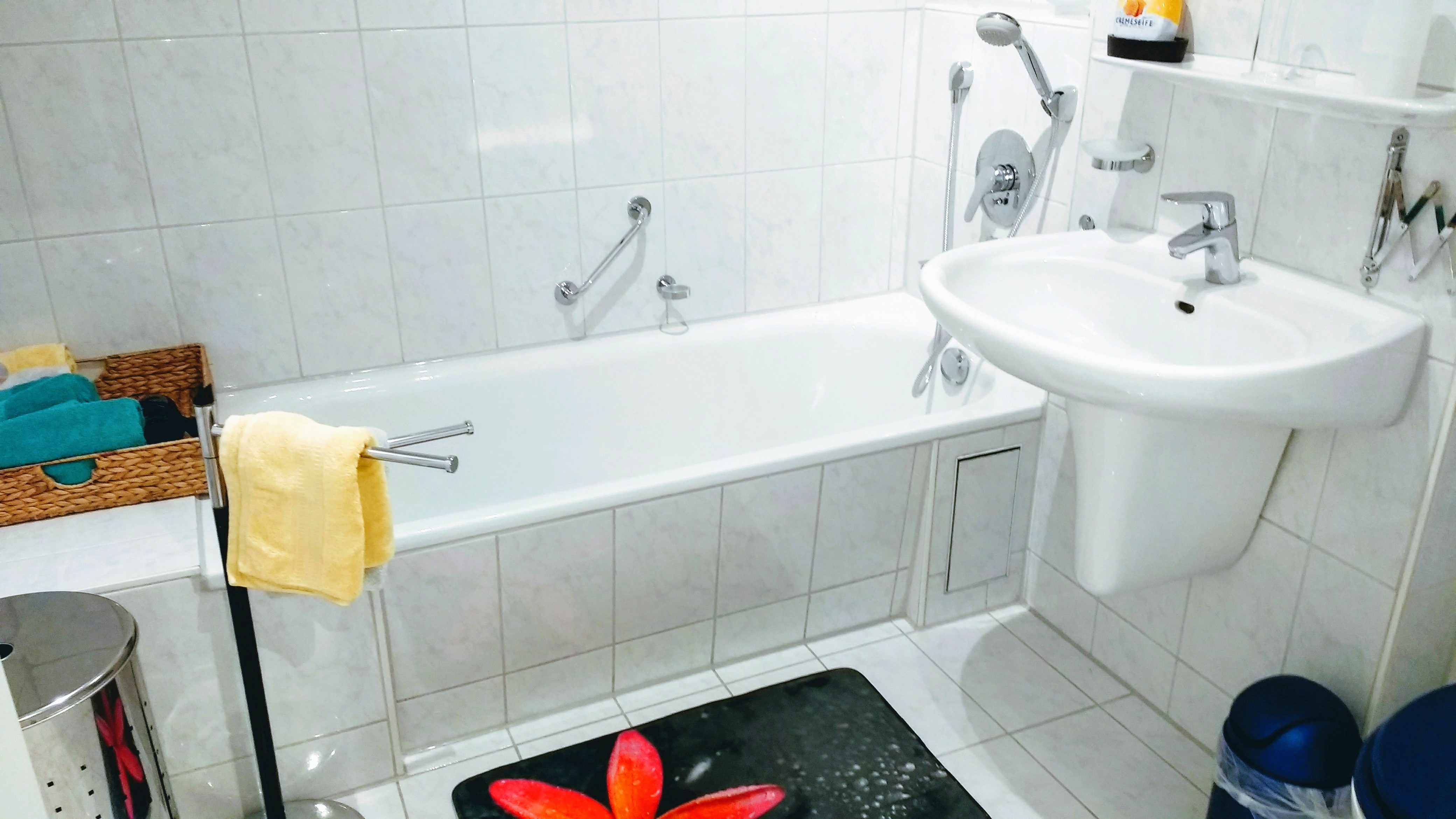Das Bad (5 qm) ist mit Badewanne, Fön und Handtücher ausgestattet. Ferner erhalten Sie die Bettwäsche (incl. 1x wöchentlicher Wechsel) gestellt.