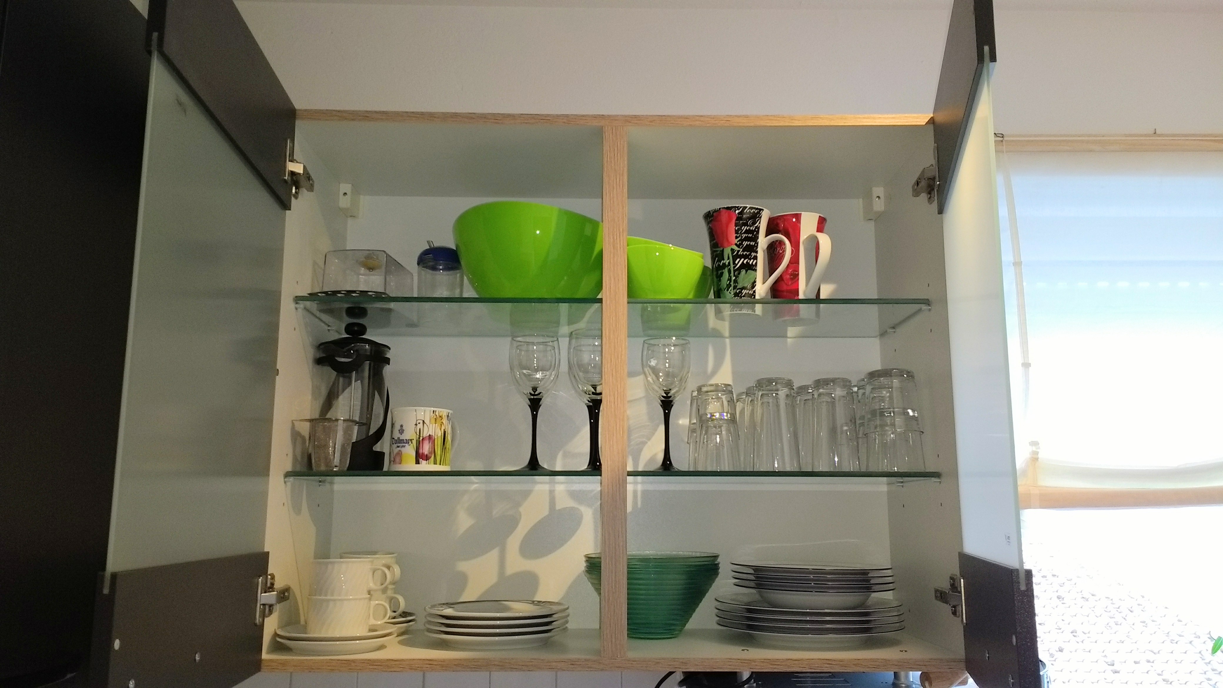 Ferner: Einbauküche mit Essplatz, ausgestattet mit Espresso (Kapsel-)/ Kaffeemaschine, Wasserkocher, Kühl-Gefrierschrank mit 3 Sterne-Fach, außerdem Mikrowelle sowie Radio-CD-Player. In der Garderobe befinden sich zwei weitere Schränke.