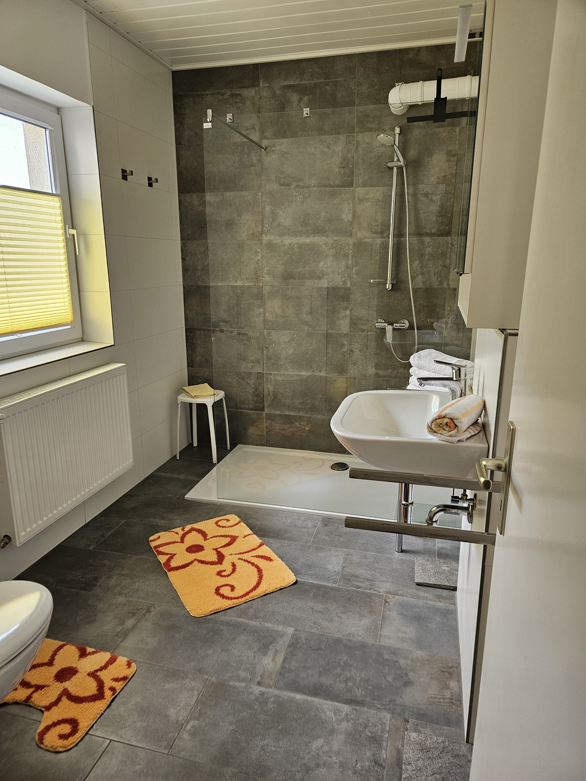 Das helle Badezimmer mit Dusche, Waschbecken und WC hat ein großes Fenster.
