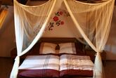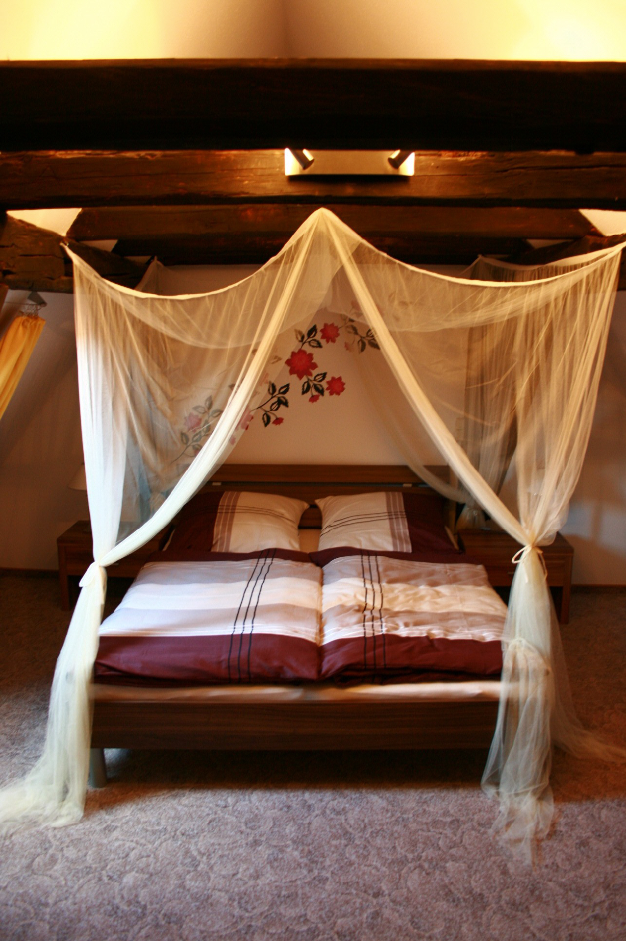 Das romantisches Himmelbettzimmer (Doppelbett)befindet sich im Spitzdach unter der Kulisse des historischen Gebälks des typisch fränkischen Fachwerkhauses, hinter dem Lesezimmer.