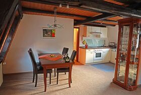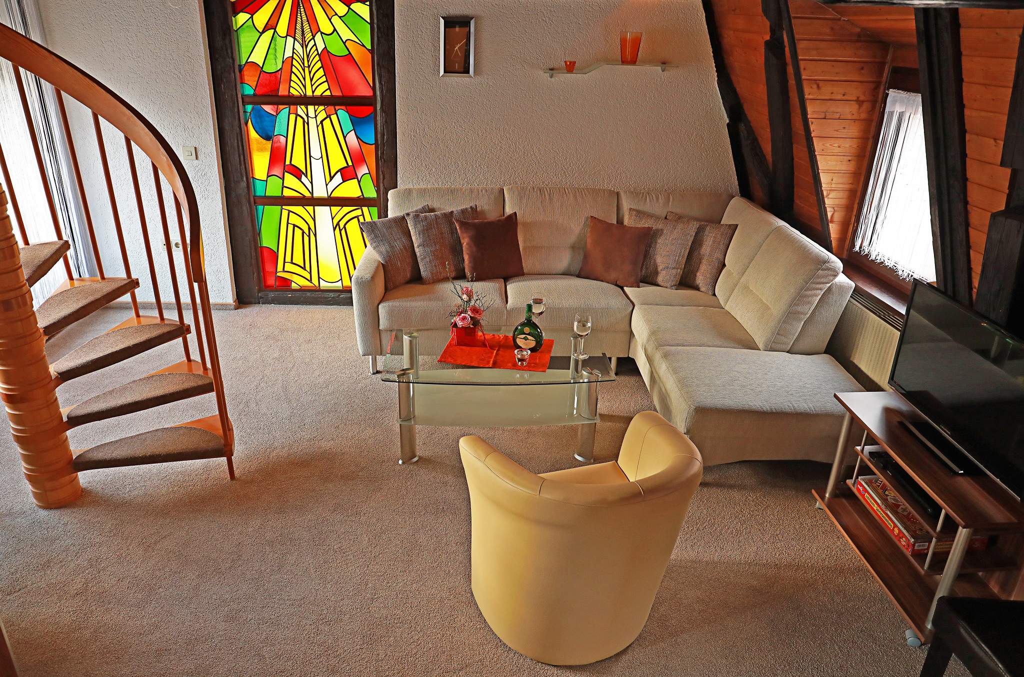 Der helle offene Galerie-Wohnraum mit Flair besticht im ersten Stock mit Spindeltreppe, bleiverglastem Fenster und alten Dachbalken. Integriert sind die großzügige Küchenecke, eine Essecke und eine gemütliche Polsterecke mit Flachbild-Sat-TV, CD-Radio und Spielesammlung. Im Sommer bringt hier eine Klimaanlage angenehme Temperaturen.