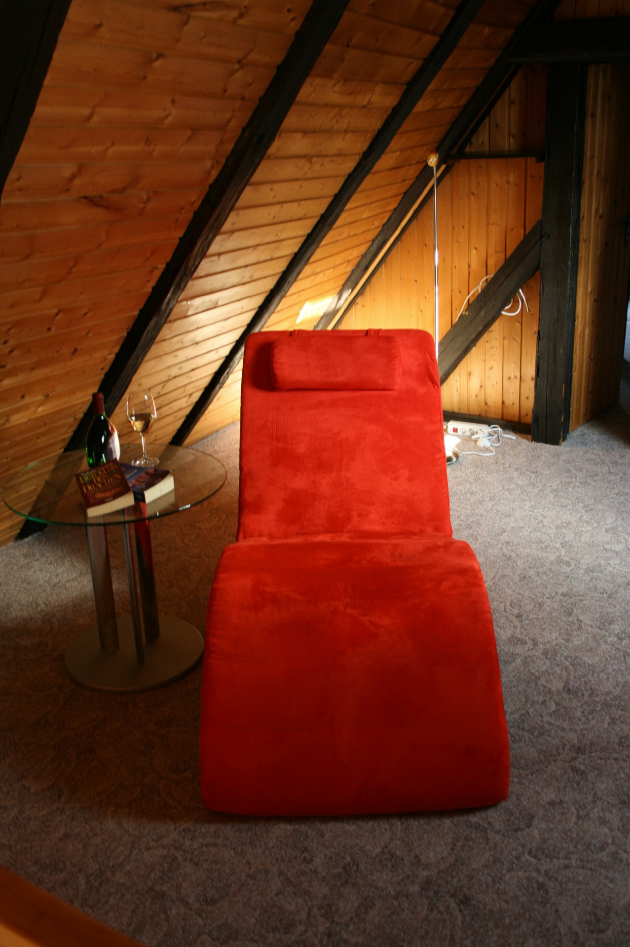 Im Spitzdach der Galerie, im zweiten Stock, befindet sich ein ruhiges offenes Lesezimmer mit kleiner Bibliothek, einem Safe, eine Ruheliege und einem Schlafsessel, der bei Bedarf in ein gemütliches Bett umgewandelt werden kann.