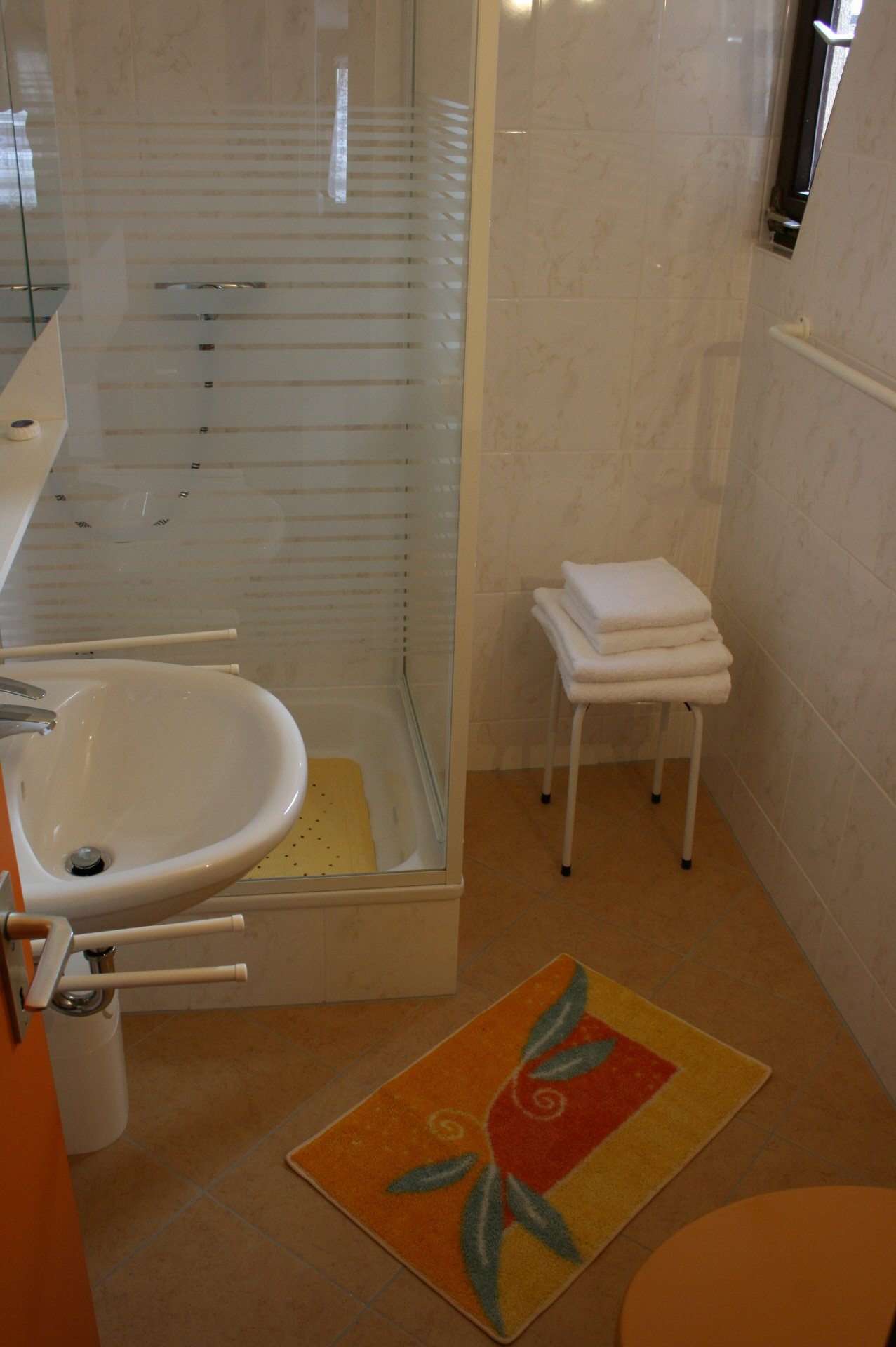 Das moderne Bad mit Waschbecken, Dusche und WC hat ein kleines Fenster.