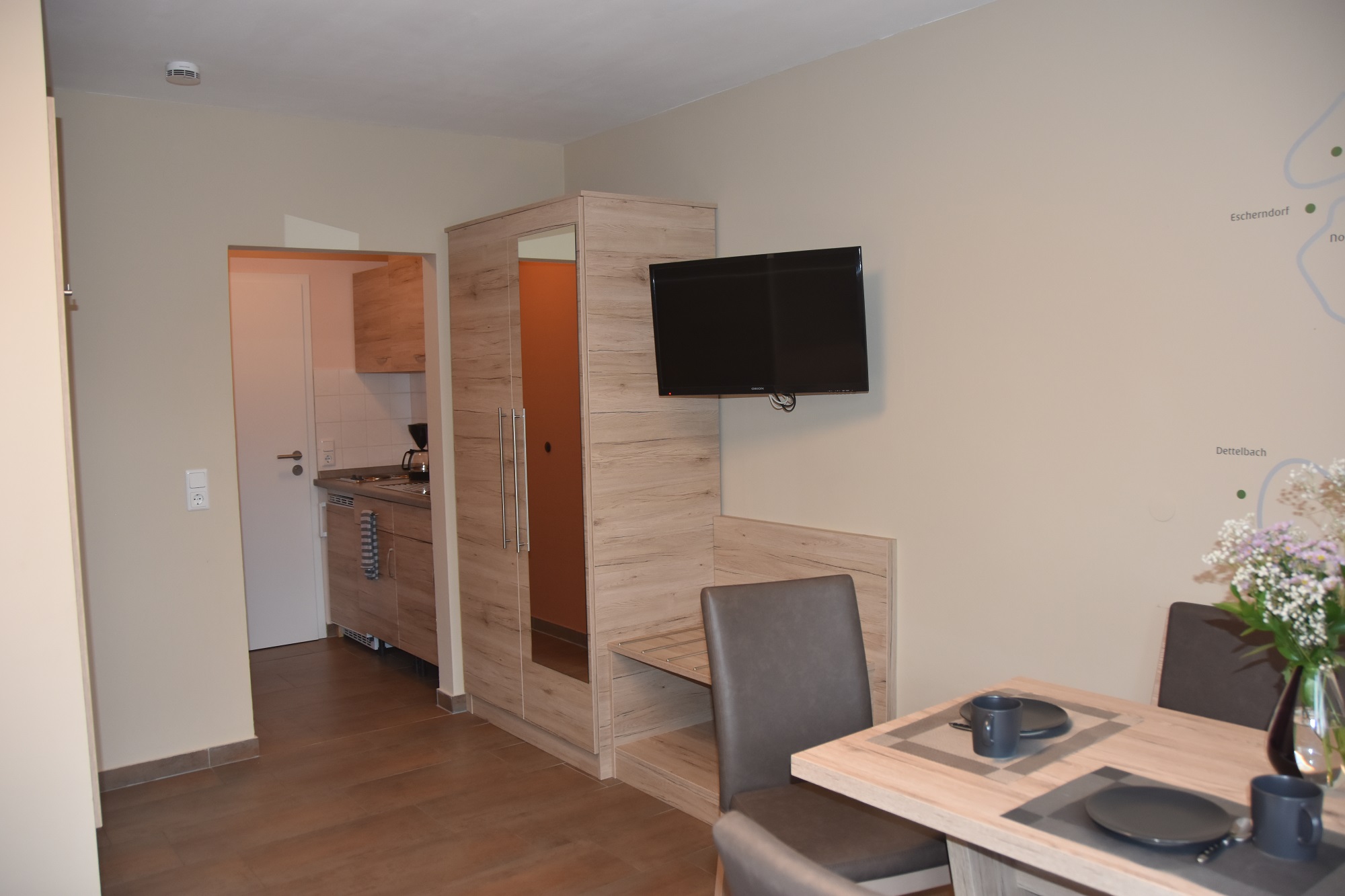 ausgestattet mit DU/WC, Föhn, Handtuch-Heizkörper, Ess-Ecke, Flat-TV, kleiner Küchenzeile mit 2 Platten-Kochstelle, Kühlschrank, Kaffeemaschine, Wasserkocher, Toaster, Geschirr/Besteck, Töpfe, Insektenschutz