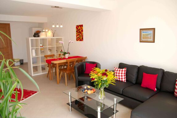 Unsere Drei-Zimmer-Ferienwohnung ( ca.60 m² ) im Erdgeschoss bietet Ihnen einen geräumigen Wohn-Essraum mit bequemen Sofa und viel Tageslicht. Die Küche ist funktional ausgestattet mit Kochmöglichkeit, Mikrowelle, Wasserkocher, Kaffeemaschine, Eierkocher, Toaster und verfügt zudem über eine Spülmaschine.