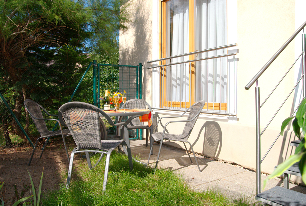 Eine großzügige Terrassentüre führt Sie direkt auf unsere sonnige Liegefläche mit Blick auf die berühmte Vogelsburg, die auf dem Haupt einer der besten Weinlagen Frankens, dem Escherndorfer Lump, thront.