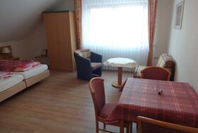 Im Einraumappartement Nr.2 mit ca.35 qm Wohnfläche befinden sich zwei trennbare Boxspringbetten und eine Schlafcouch, Küchenzeile und neue barierefreie Dusche mit WC.