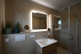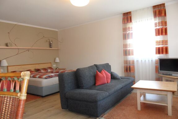 Geräumiges 1-Zimmer-Appartment (ca. 45 qm) mit Küche. Helles Bad mit Dusche, WC und Fön. Schlafcouch im Wohnbereich Sowie TV.