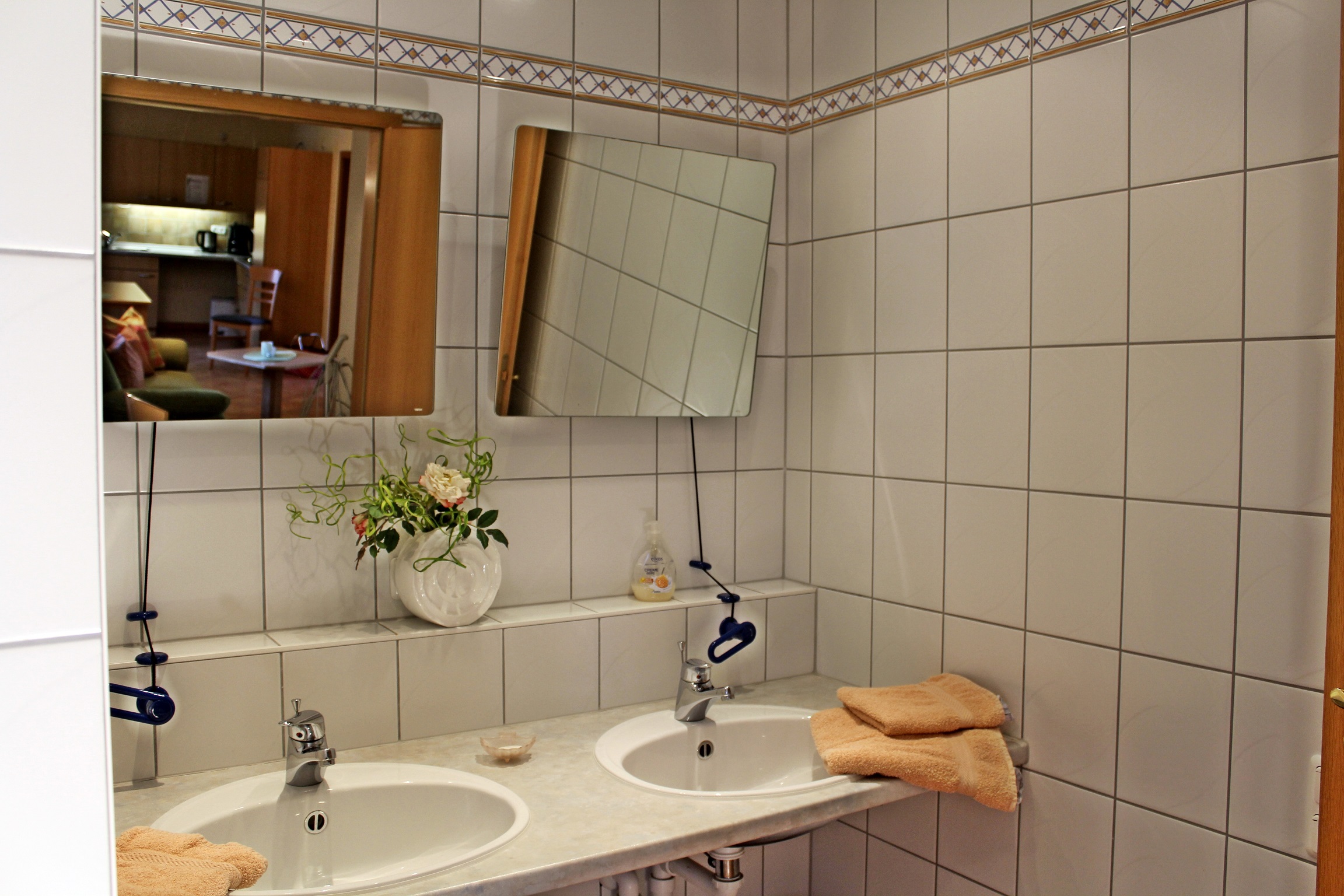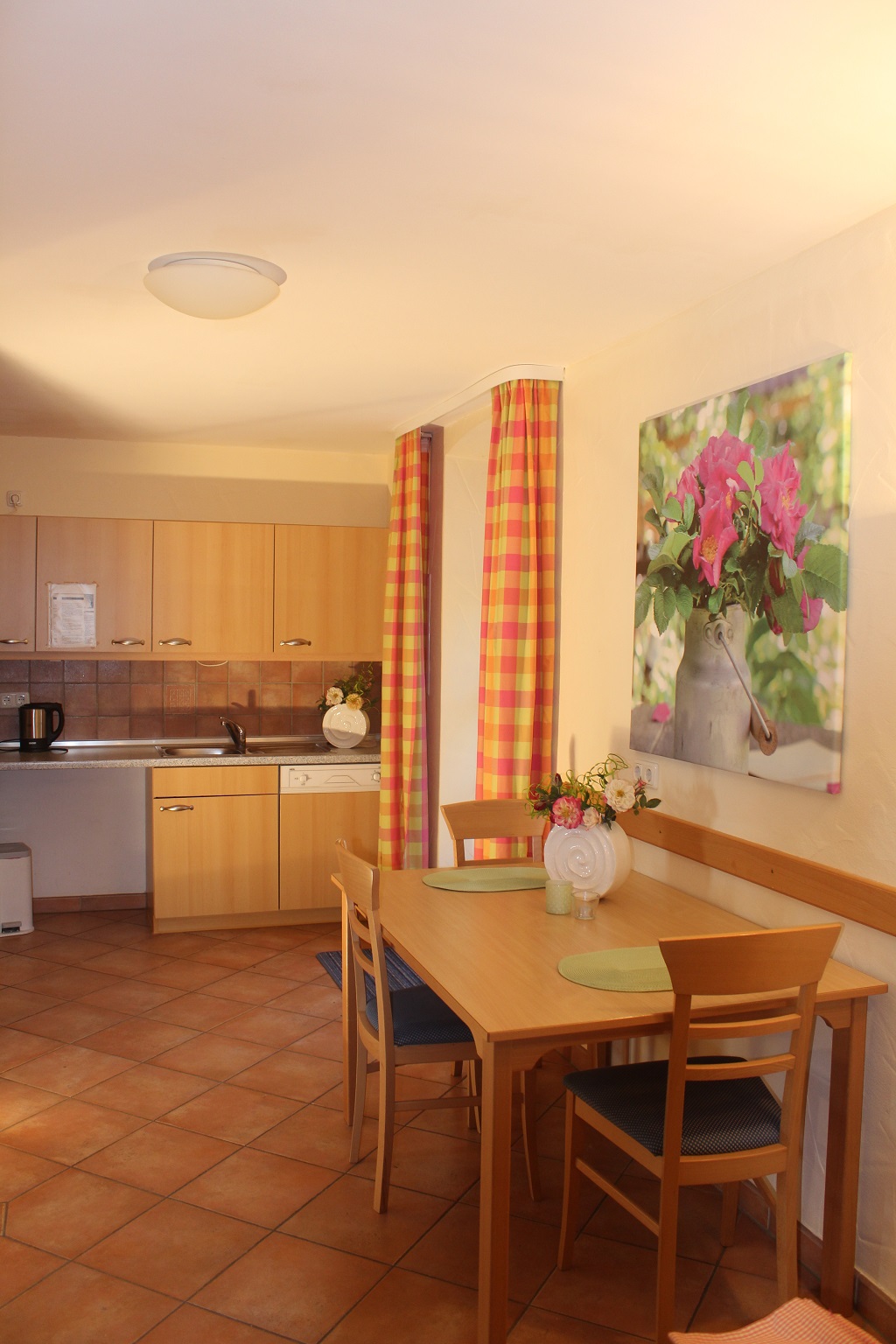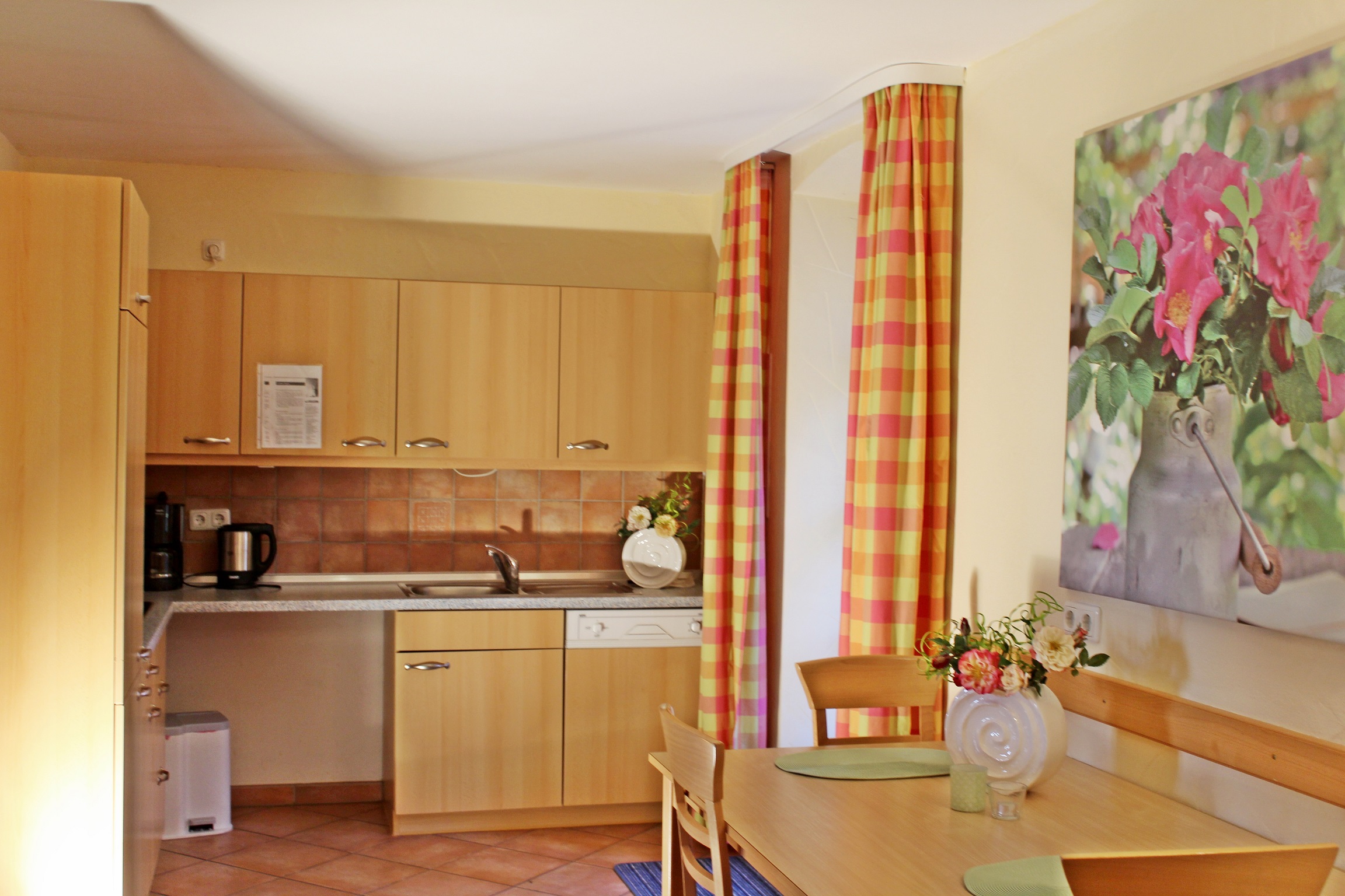 Rollstuhlgerecht, Komfortabel und gemütlich eingerichtete Ferienwohnung, komplett aus- gestattete Küche mit Geschirrspüler, Bad mit Dusche und WC, Radio-/TV-Anschluss.