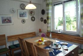 Im Erdgeschoss befindet sich die hochwertige, komplett eingerichtete Küche. Hier finden Sie Spülmaschine, Mikrowelle, Backofen, Herd, Kühlschrank, Wasserkocher, Kaffeemaschine, Toaster, Eierkocher, Radio, sowie eine Sitzecke, in welcher man gerne auch etwas länger sitzen bleibt. Das gemütliche eingerichtete Wohnzimmer (EG) mit Flat-TV, WLAN, integrierter Kinderspielecke und angrenzenden Esszimmer bildet einen großzügigen Raum mit vielen Möglichkeiten für Spiel und Unterhaltung. Im Badezimmer (EG) mit Dusche, Wanne und WC liegen Fön und Handtücher für Sie bereit.