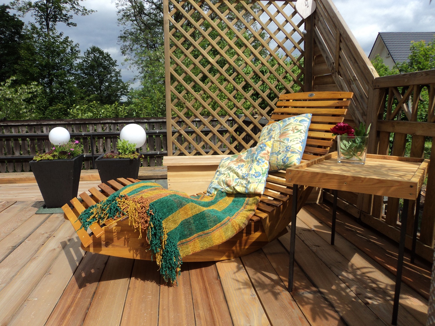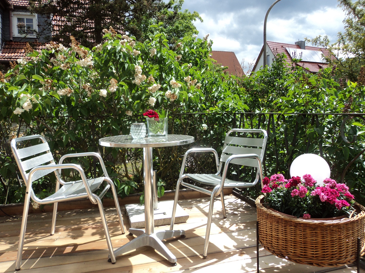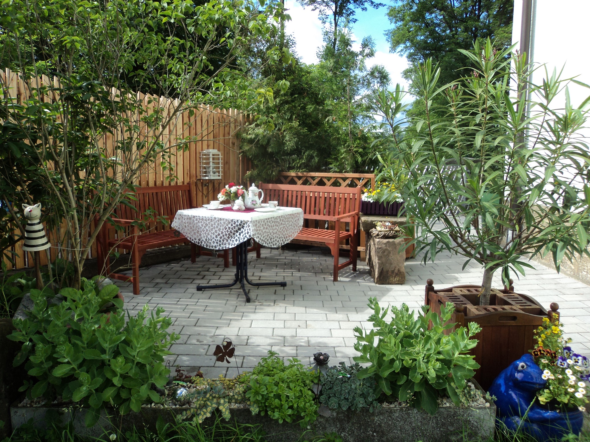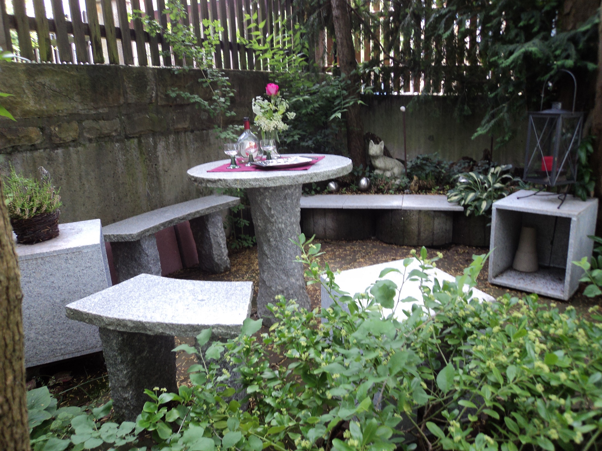 Im Garten lädt ein romantischer und schattiger Platz zu einem Glas Wein ein. Im südlichen