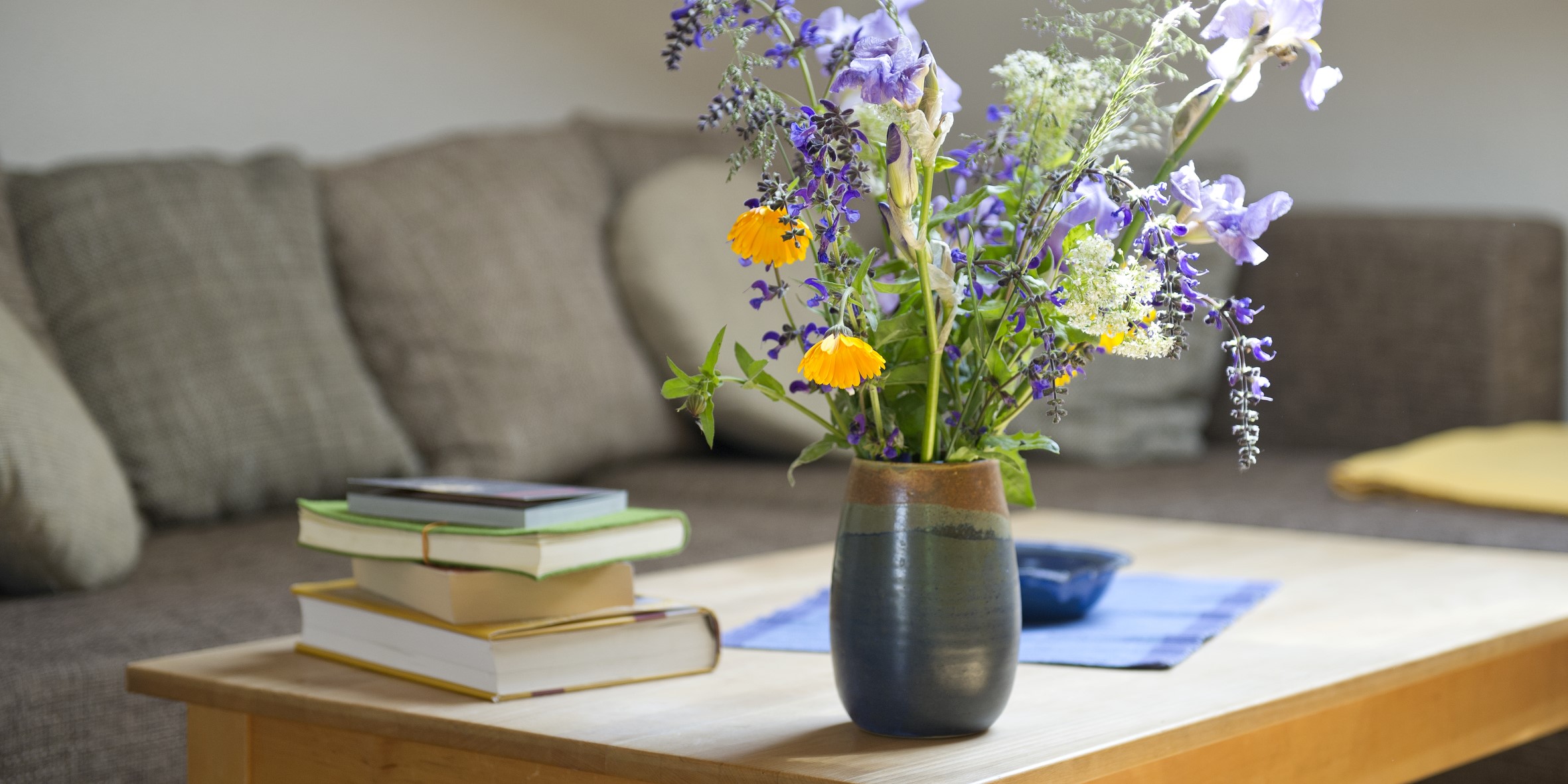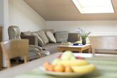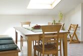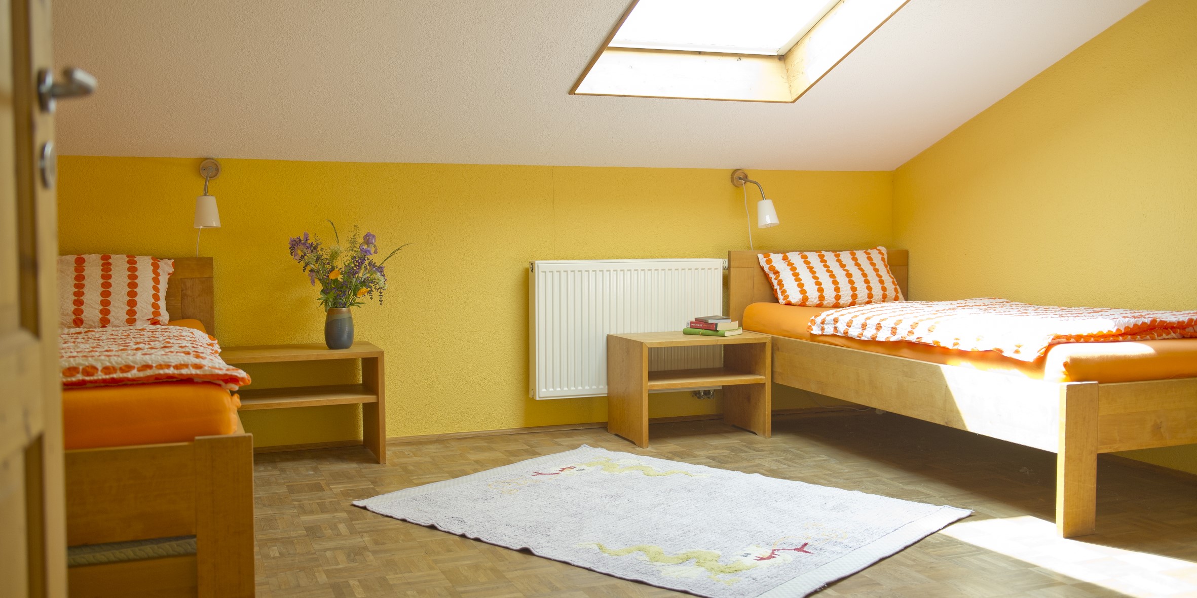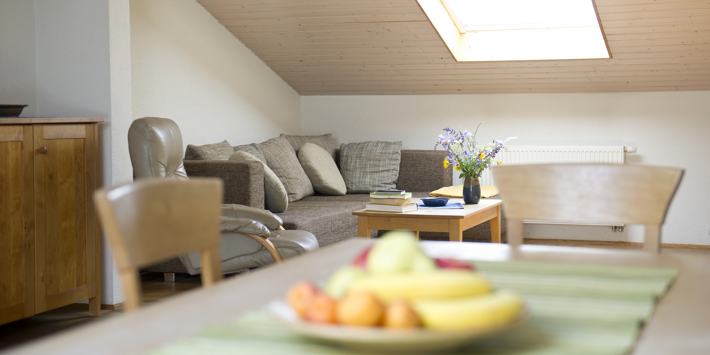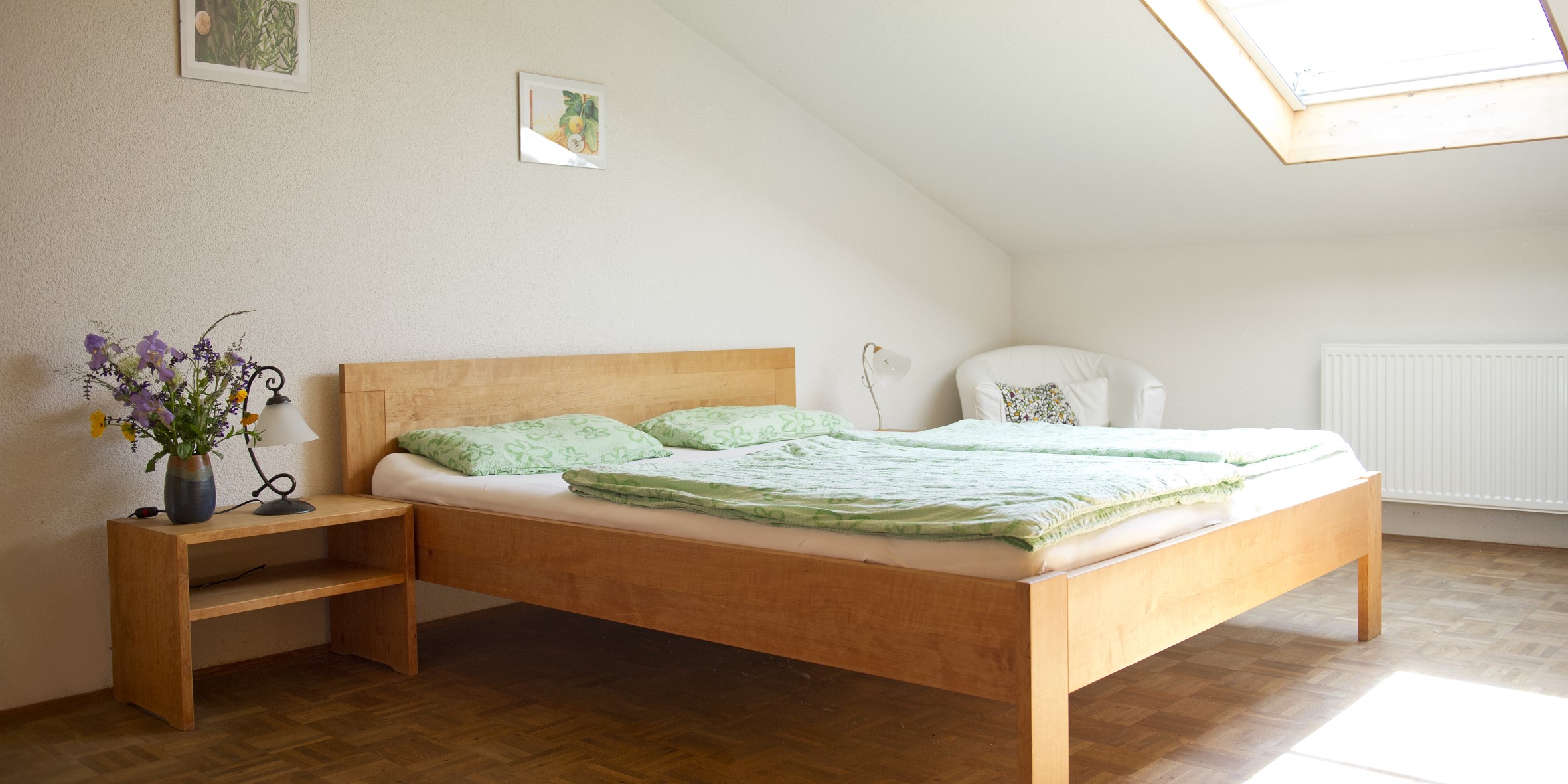 Die Wohnung Unterm Dach ist ca. 110m² groß und sehr schön mit naturbelassenen Vollholzmöbeln vom Schreiner, geölten Parkett- und Fliesenböden eingerichtet.