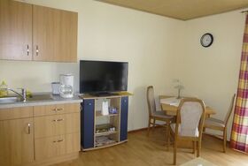 Die Ferienwohnung 1 hat ein Wohnzimmer mit Küchenzeile, Sofa und Essecke; Schlafzimmer mit Doppelbett; Nasszelle mit WC und Dusche. SAT-TV im Wohnzimmer.