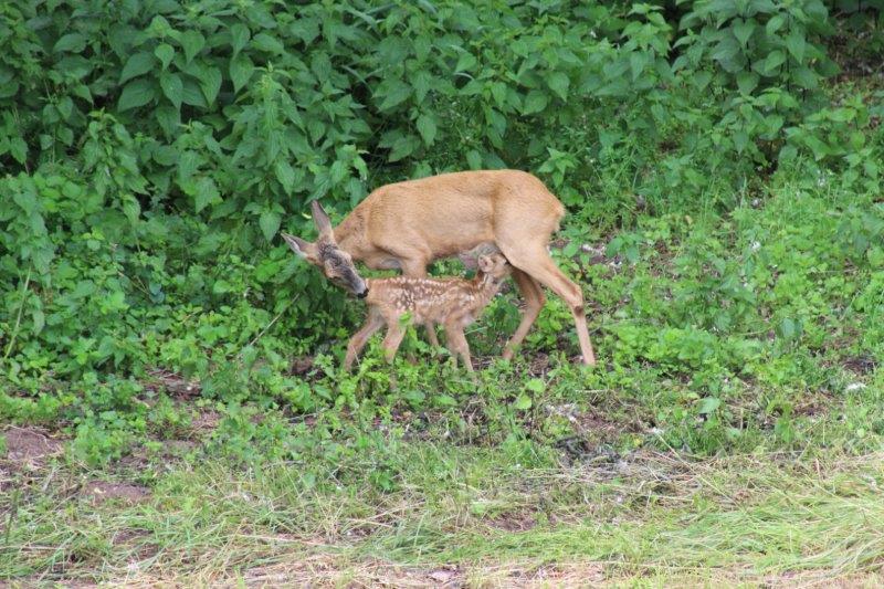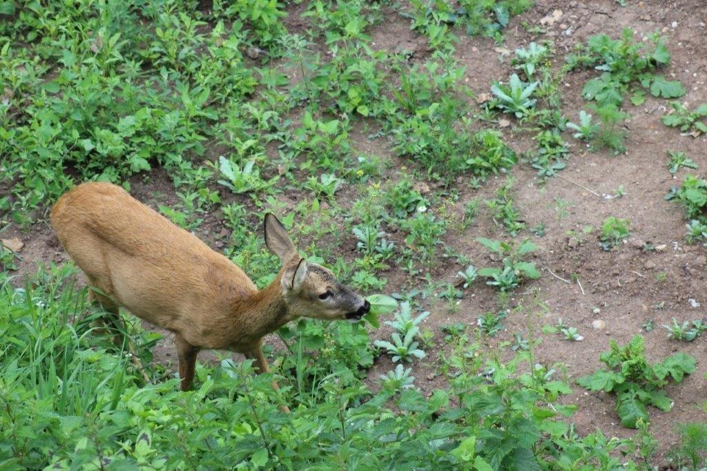 Von der Küche blickt man über das Feuchtebiotop bis hin zum Storchenhorst auf dem Schornstein der Brauerei im Nachbarort Kaltenbrunn.